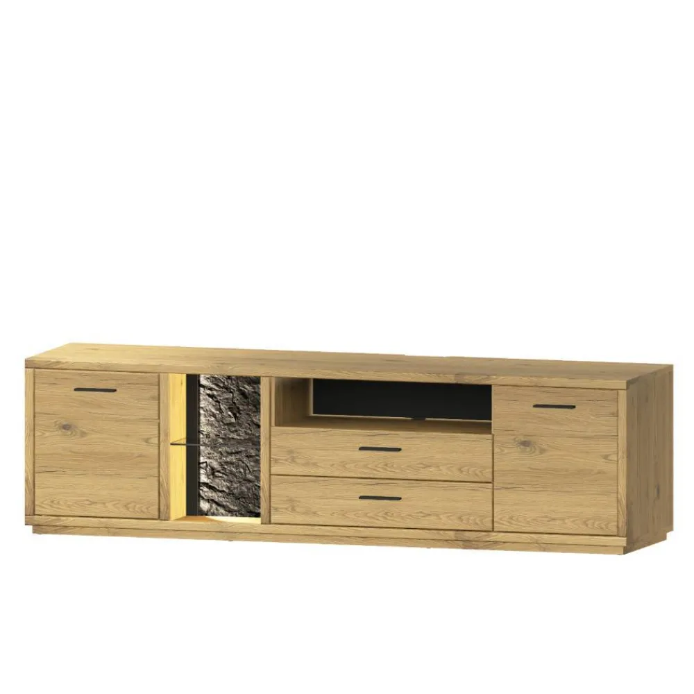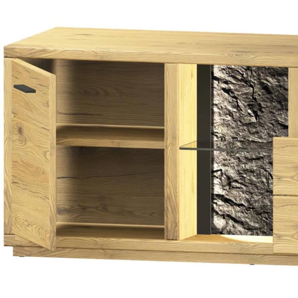 - Offenes Fach mit einem Glasboden, Rückwand Rioja-Felsenoptik in Grau-Braun, MDF Rahmen schwarzgrau lackiert