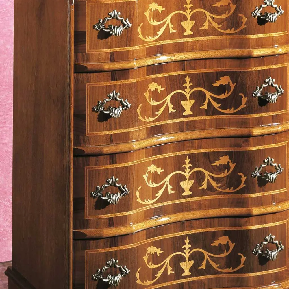 - Holzoberfläche lackiert, MDF mit Nussbaumholz furniert, Intarsien aus Pappelholz, gesamt lackiert