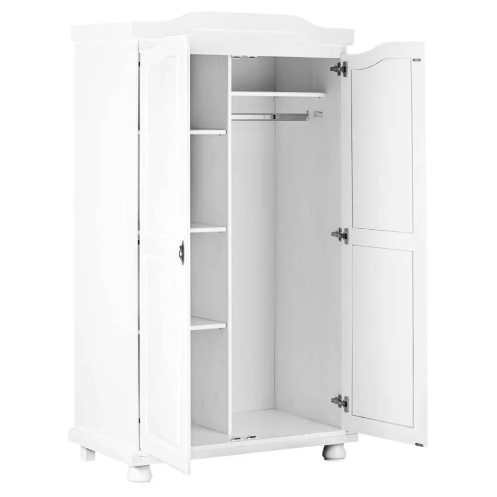 - Innen rechts ein Einlegeboden und eine Kleiderstange, links drei Einlegeböden