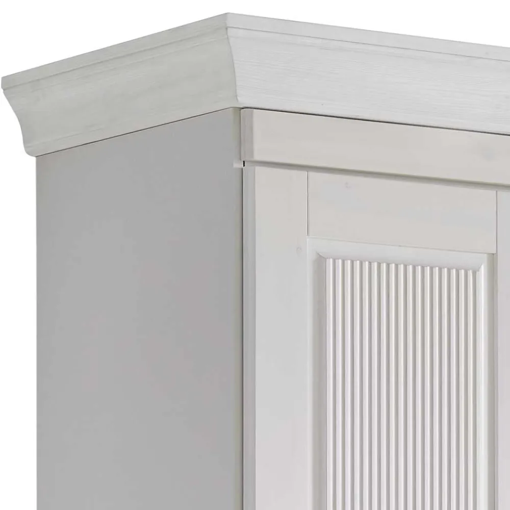 - Aus Kiefer Massivholz (Front, Kranzleiste, Einlegeböden und Sockel), Spiegelglas und MDF (Seiten) gefertigt