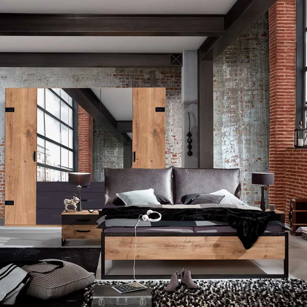 - Angesagte Schlafzimmer Möbel in Plankeneiche Holzoptik, Schwarz und Schwarzgrau
