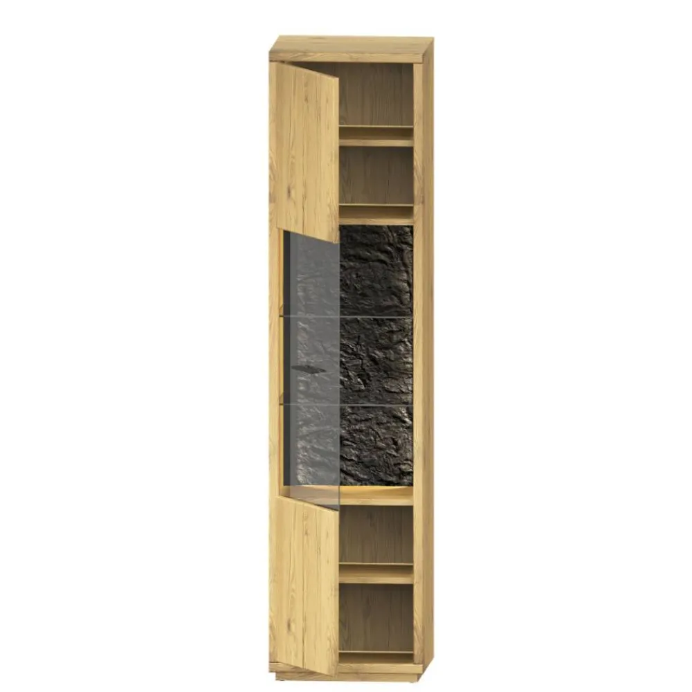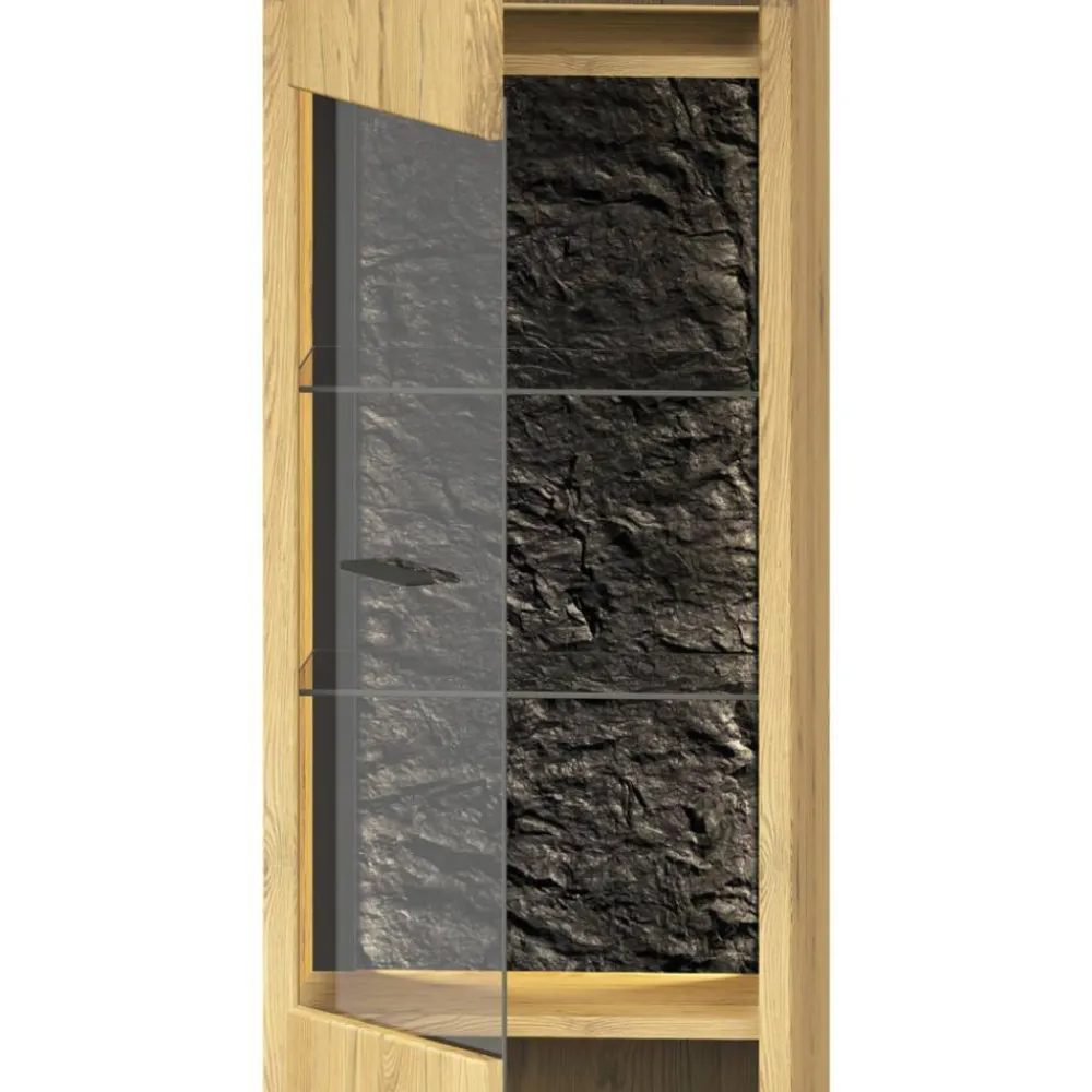 - Offenes Fach mit einem Glasboden, Rückwand Rioja-Felsenoptik in Grau-Braun, MDF Rahmen schwarzgrau lackiert