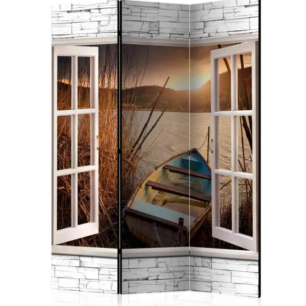 - Ansprechendes Motiv mit geöffnetem Fenster, Boot und Seenlandschaft in 3D-Optik