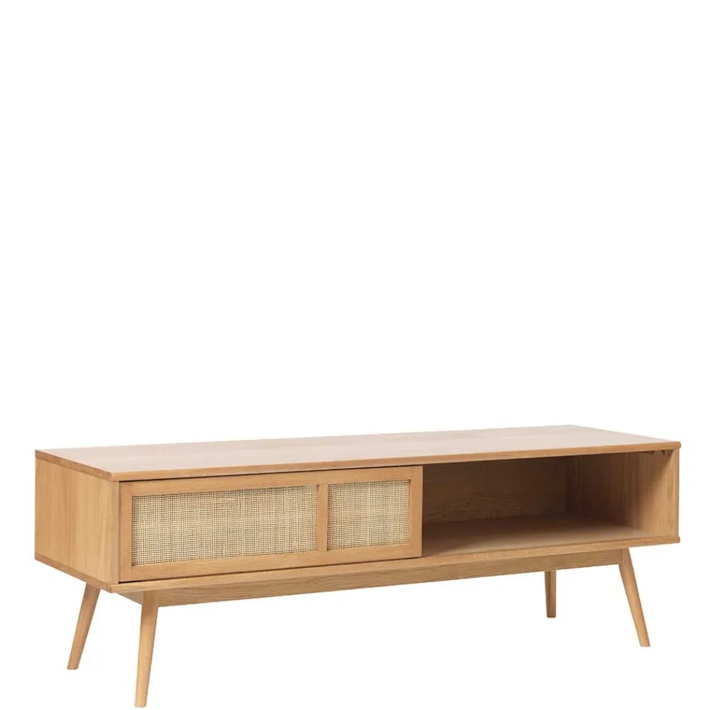 - Aus Holzwerkstoff, Eiche Massivholz und Rattan gefertigt