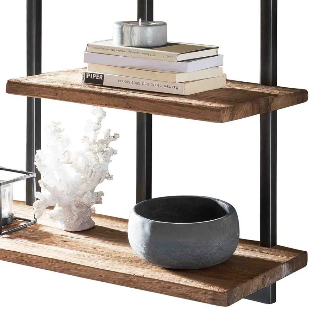 - Ein Metallrahmen mit vier unterschiedlich großen Holzböden, versetzt angeordnet