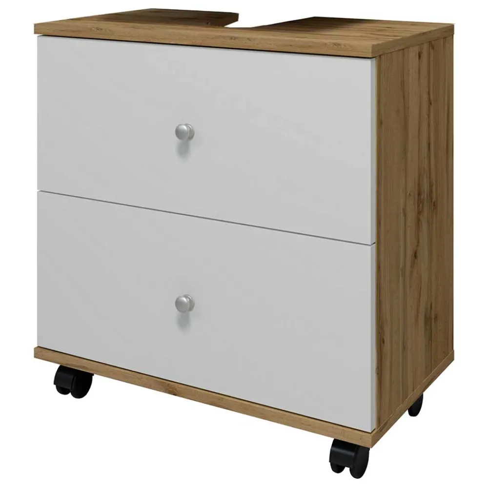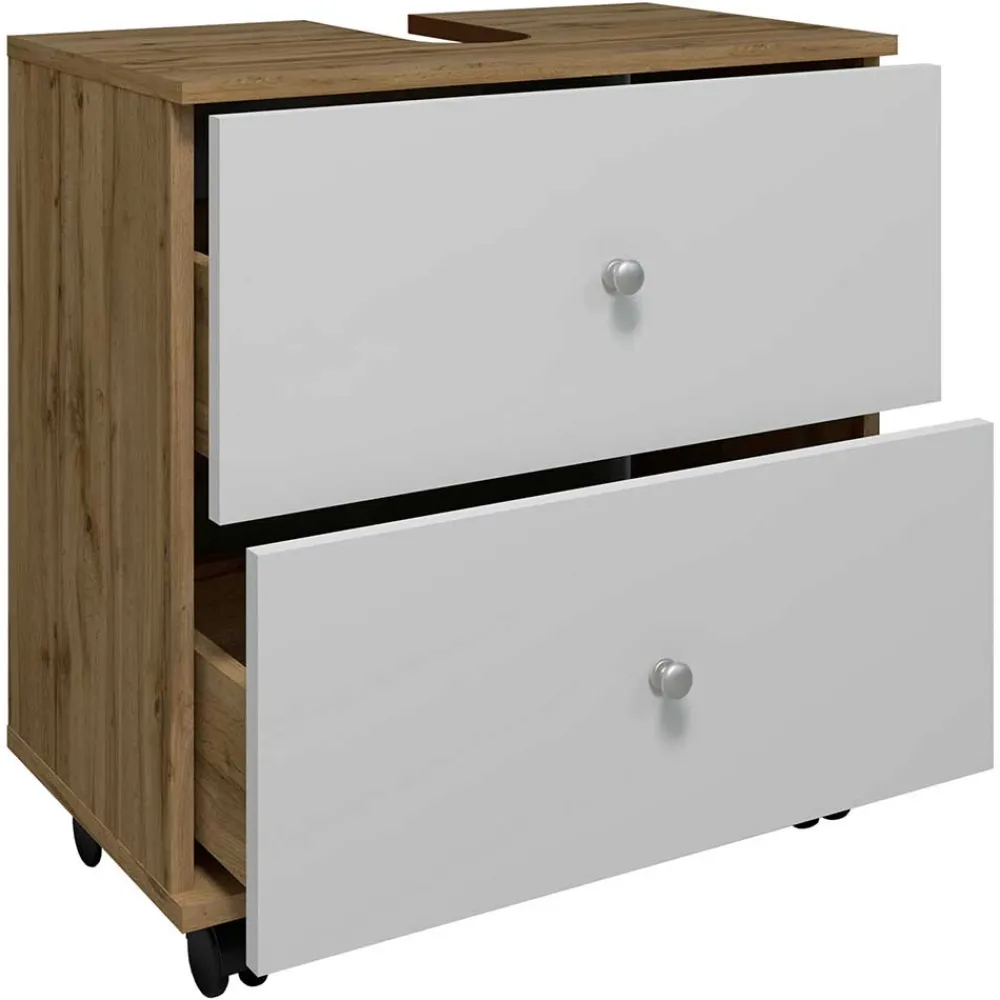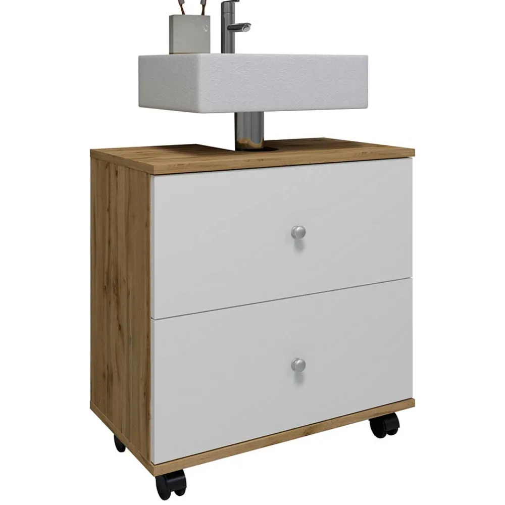 - Zeitloser Waschbeckenunterschrank in Weiß und Wildeiche Honigfarben