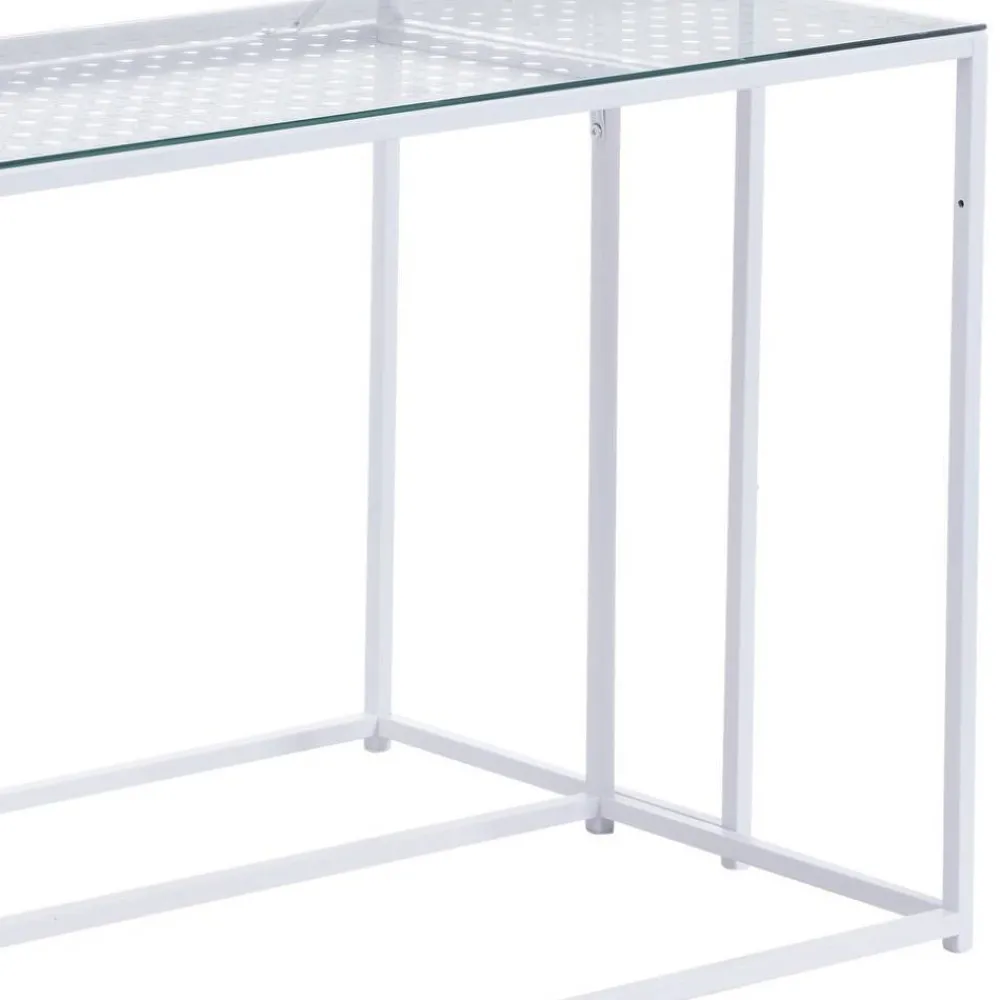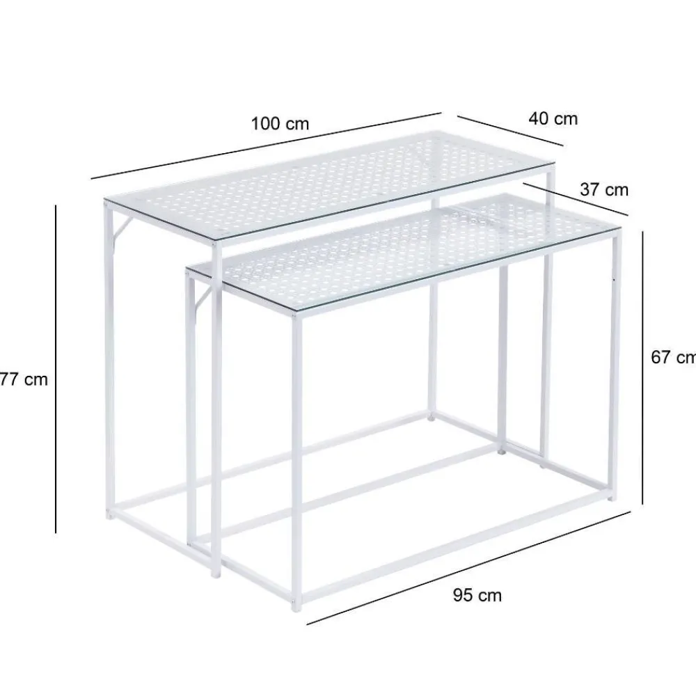 - Tischplatten aus klarem Sicherheitsglas, darunter dekorative Metallgitter