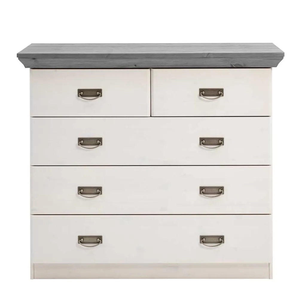 - Zwei kleine und drei große Schubladen mit Metallauszug