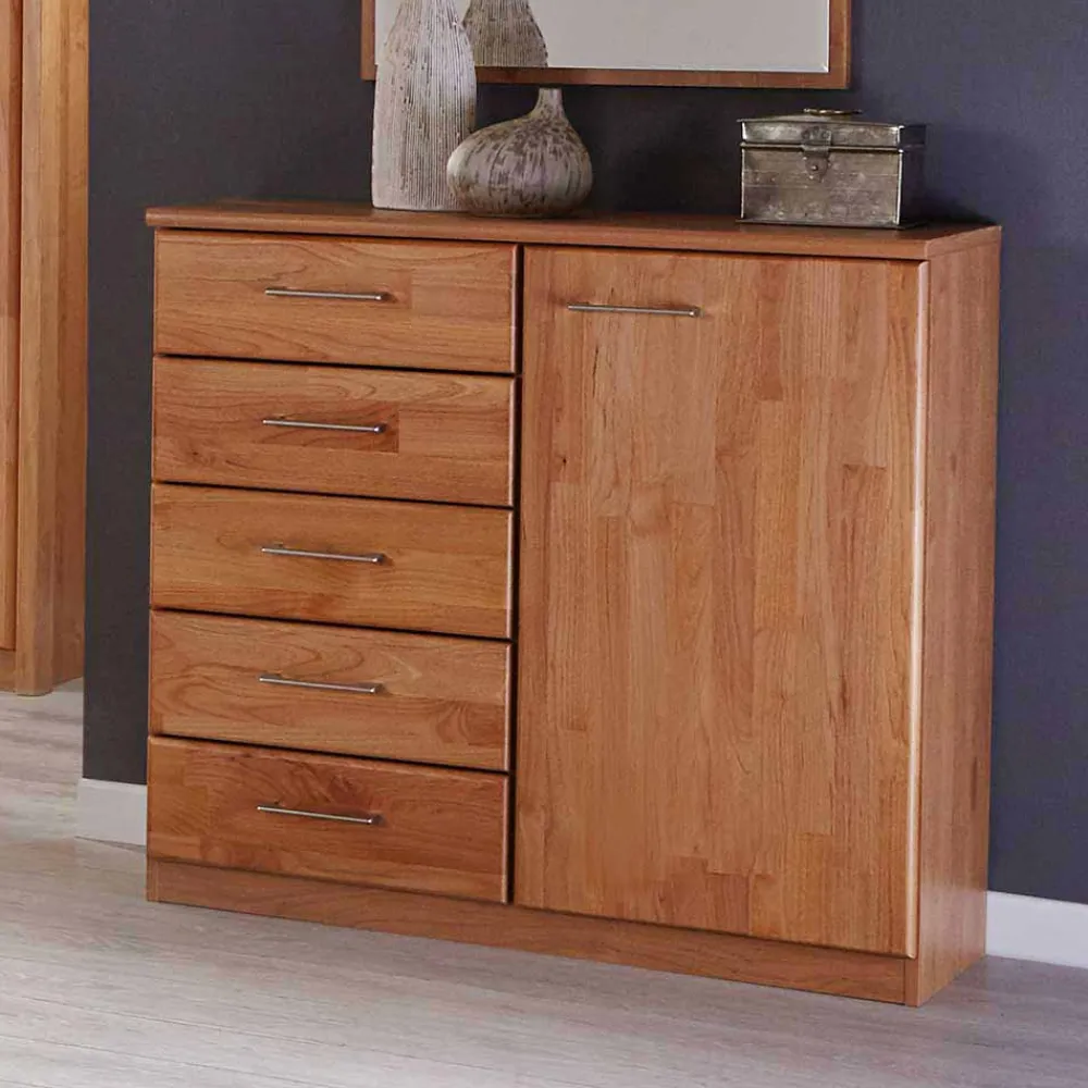 - Holzwerkstoff Oberflächen (Korpus, Sockel und Abdeckplatte) im Holzdekor Erle foliert, Massivholz (Front) lackiert