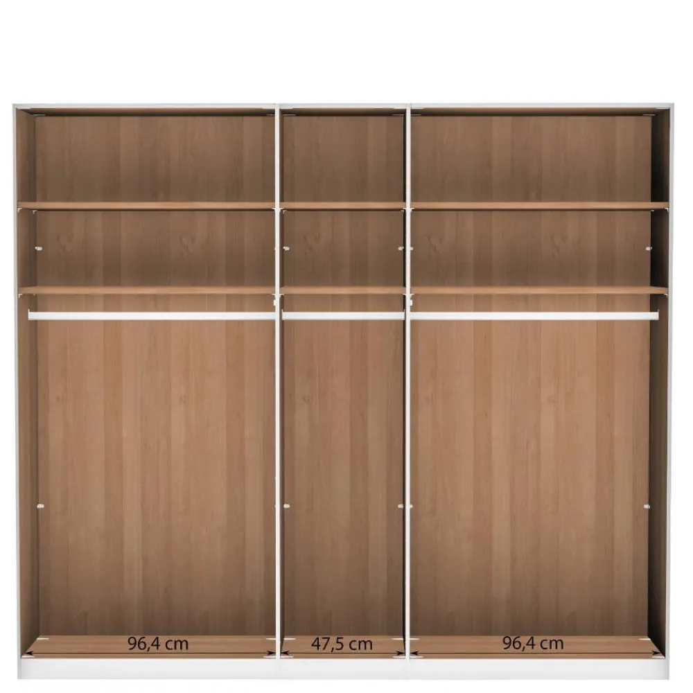 - Mit drei festen Kleiderstangen und sechs Einlegeböden