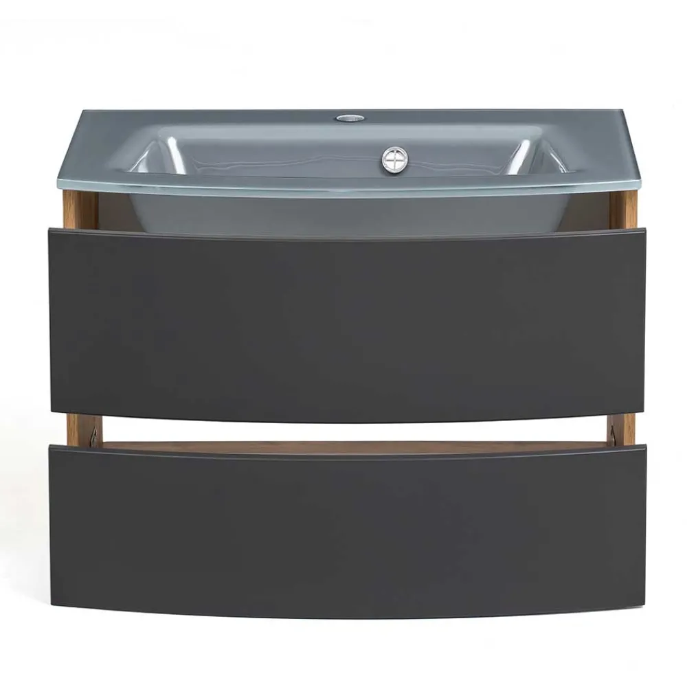 - Zwei geräumige Schubladen mit Metall-Vollauszug und Soft Close Funktion, gebogene Fronten
