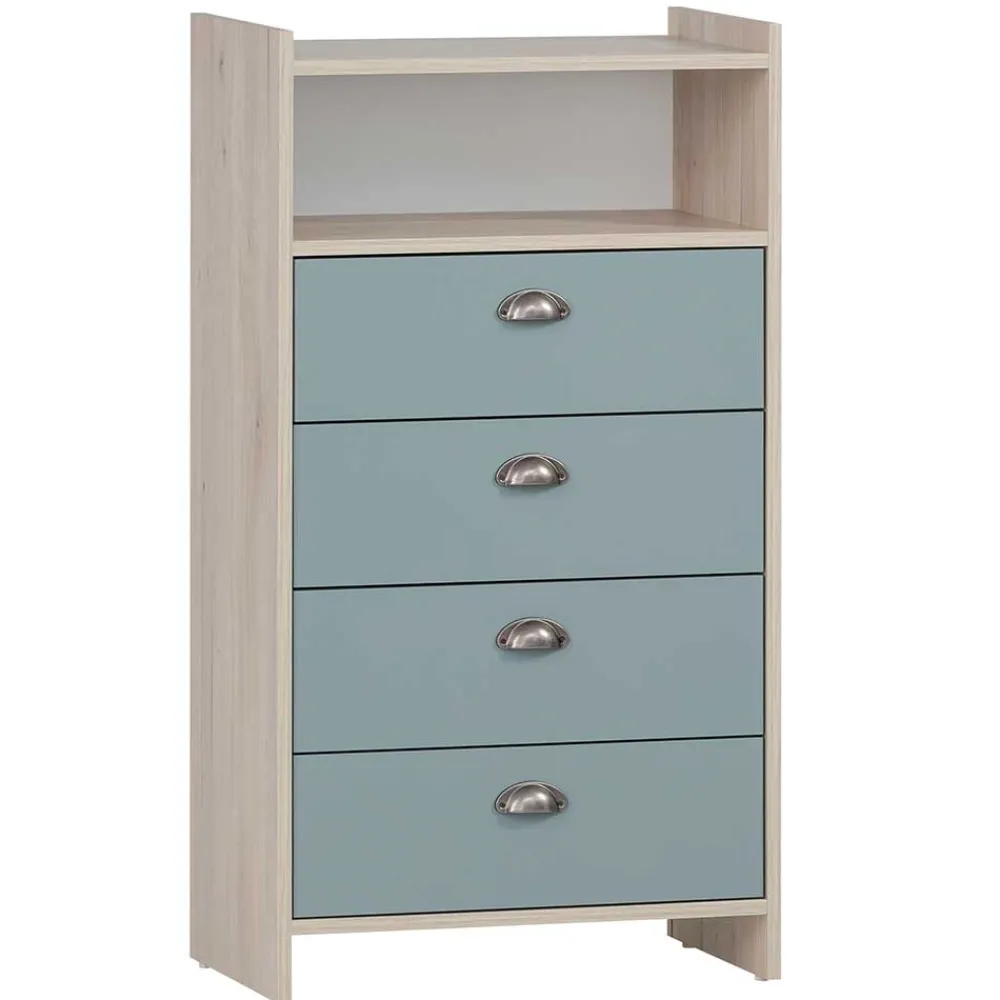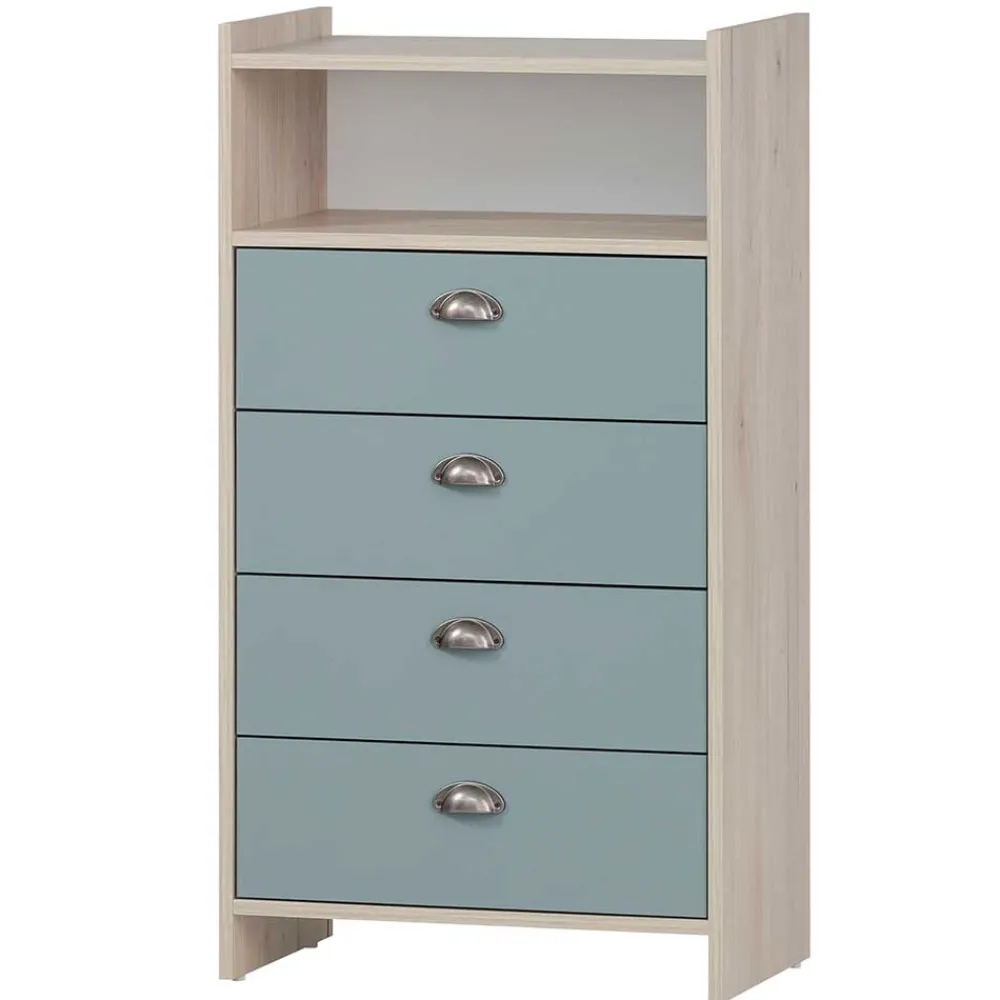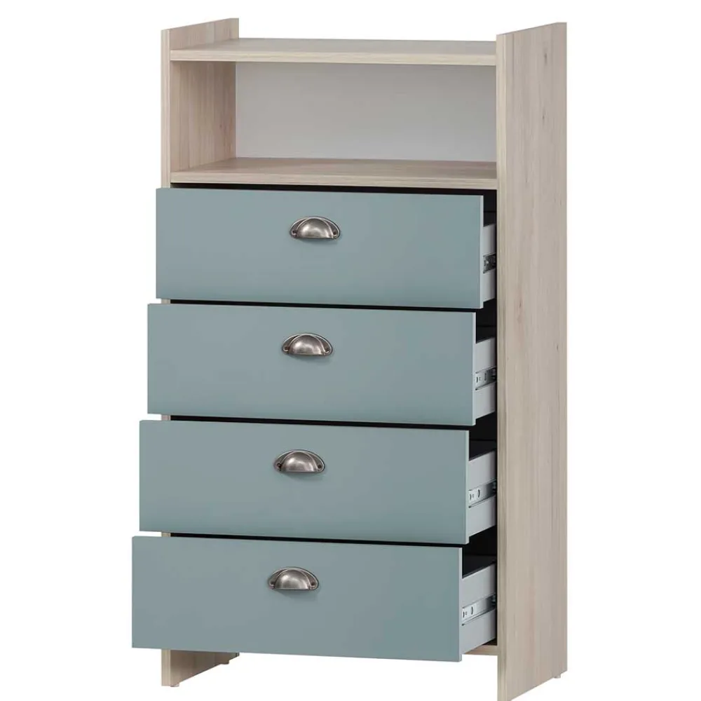 - Oberflächen in Holzoptik Eiche hell und Hellblau melaminbeschichtet