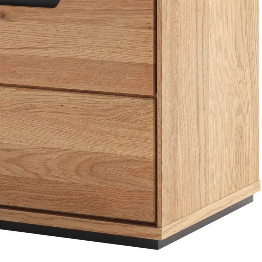 - Massivholz geölt, Holzwerkstoff außen echtholzfurniert und geölt, innen in Holzoptik foliert