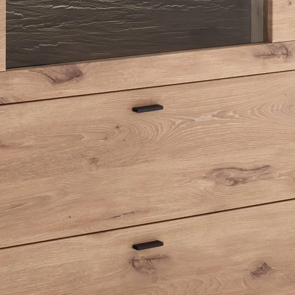 - HDF Rückwand innen in Holzoptik foliert, sichtbarer Teil in 3D Holzoptik sandgestrahlt beschichtet