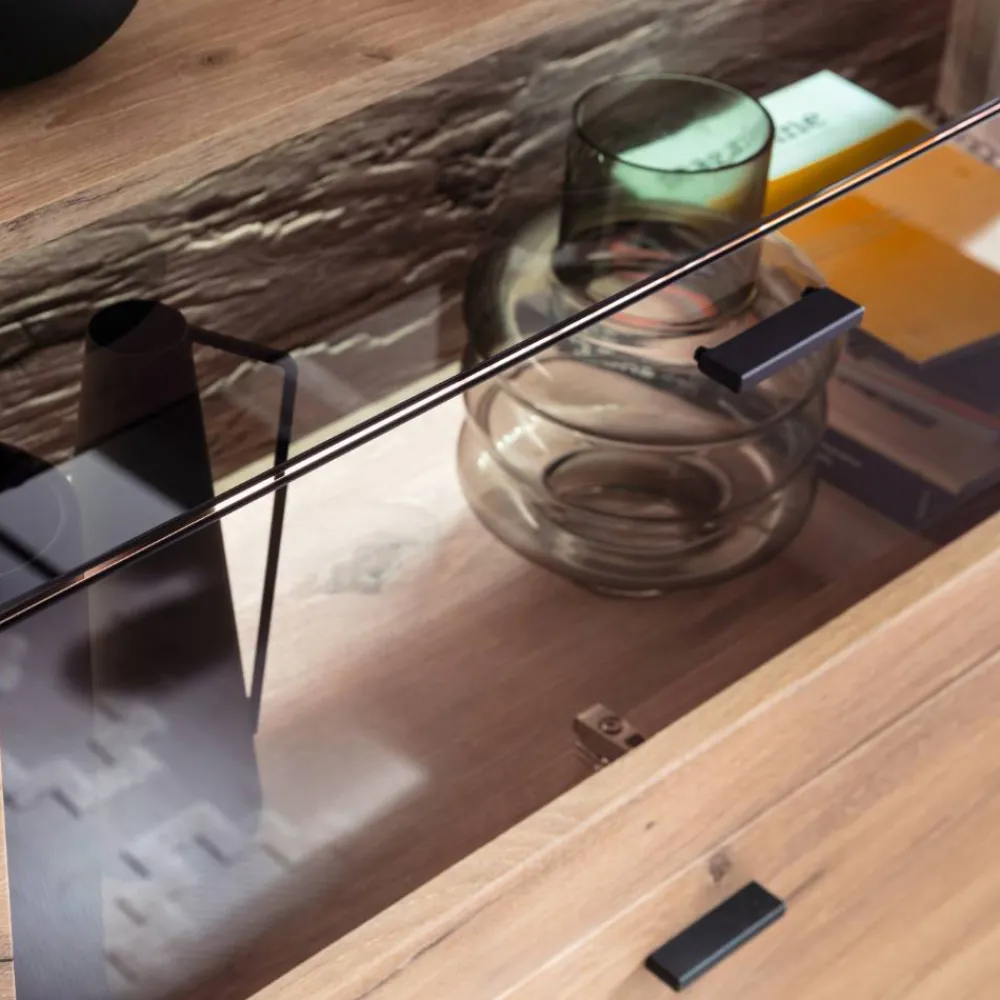 - Aus Holzwerkstoff und schwarz getöntem Glas gefertigt