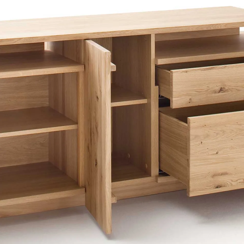 - Massivholz hell geölt, Korpus außen mit Eiche echtholzfurniert und hell geölt, innen foliert in Holzoptik Eiche Bianco, Deckplatte und Sockel vorne und seitlich mit Massivholz Anleimern (22 mm stark)