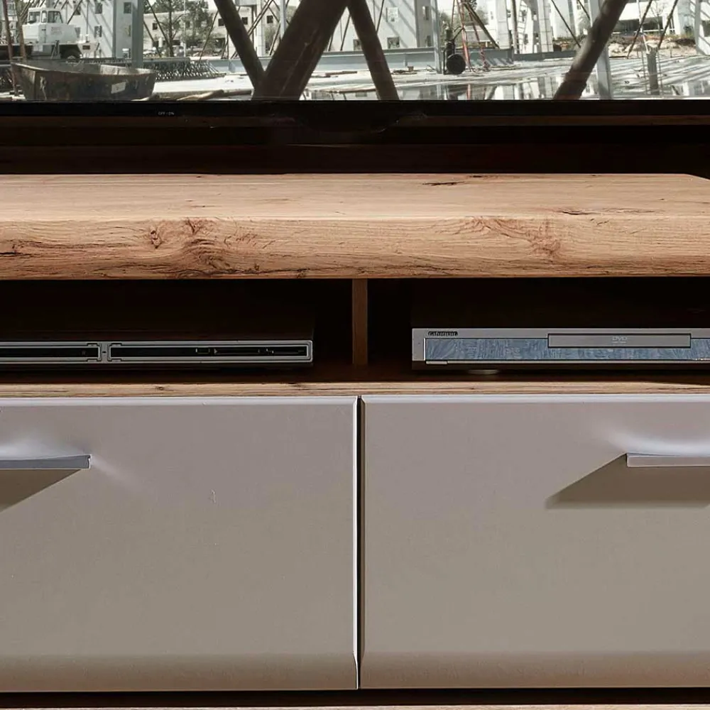 - Front foliert in Grau, sichtbare Rückwände, Böden und Hirnholzapplikationen in Eiche Altholz-Optik, melaminbeschichteter Korpus