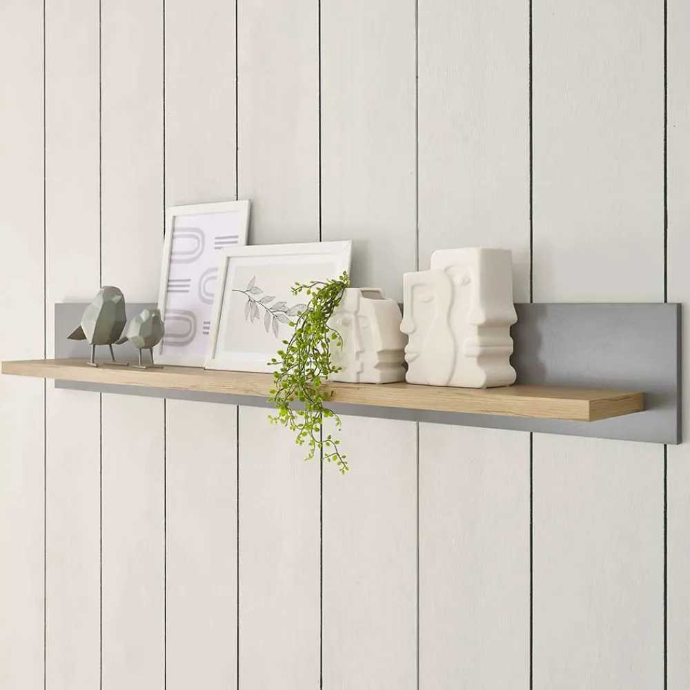 - Schlichtes Wandregal in Lichtgrau und Eichefarben