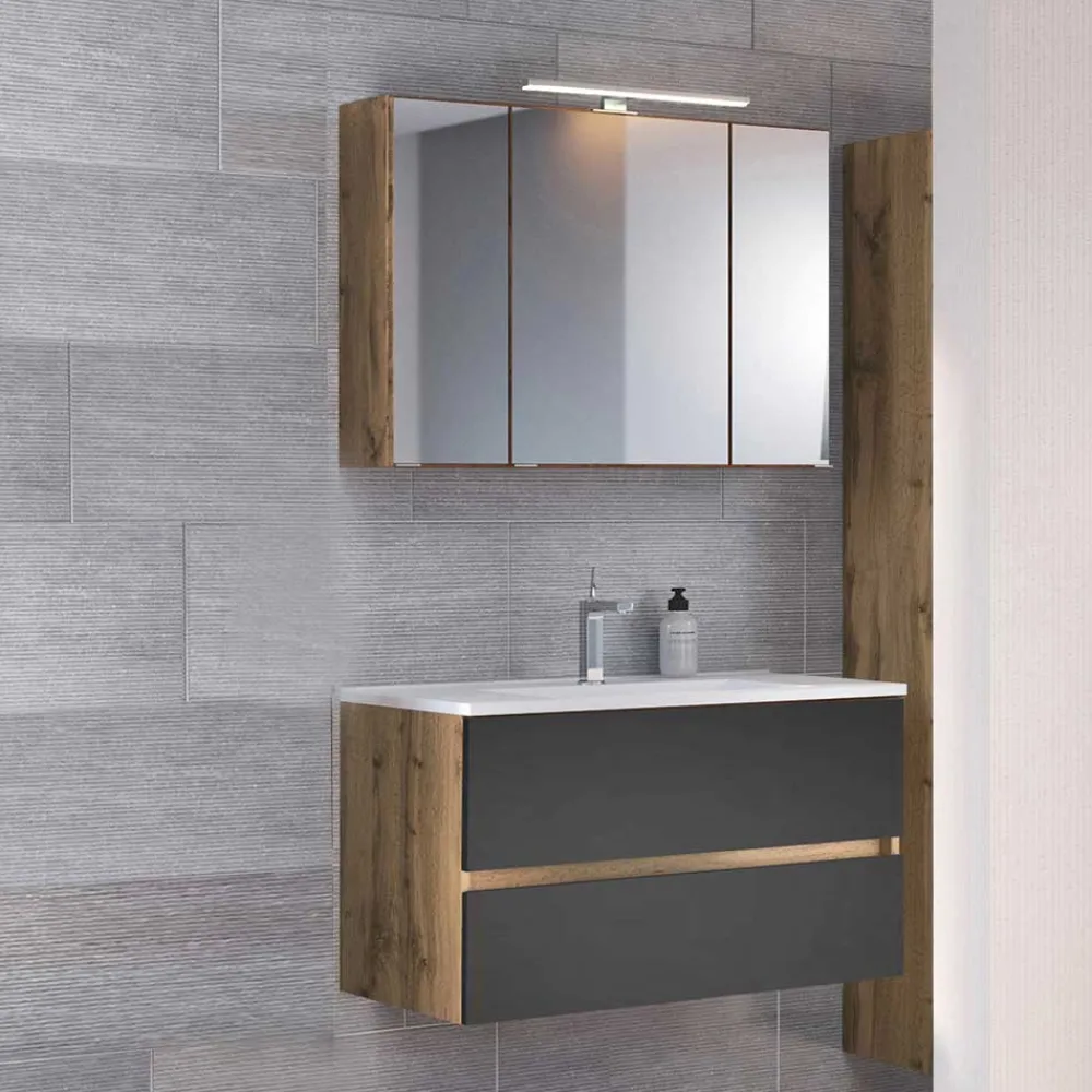 - Korpus sorgfältig melaminbeschichtet in Holzoptik Wildeiche, Waschtischfront foliert in Dunkelgrau matt