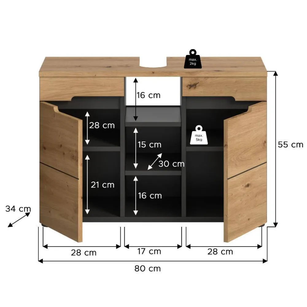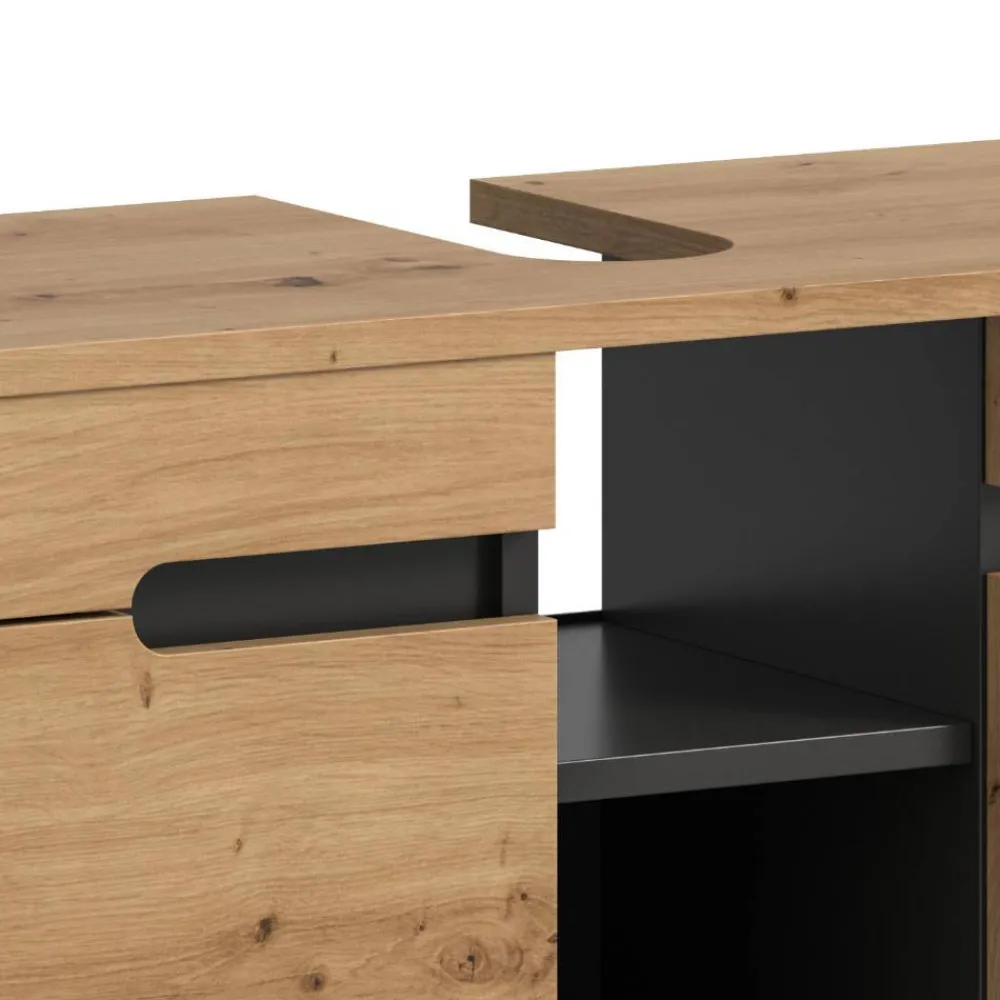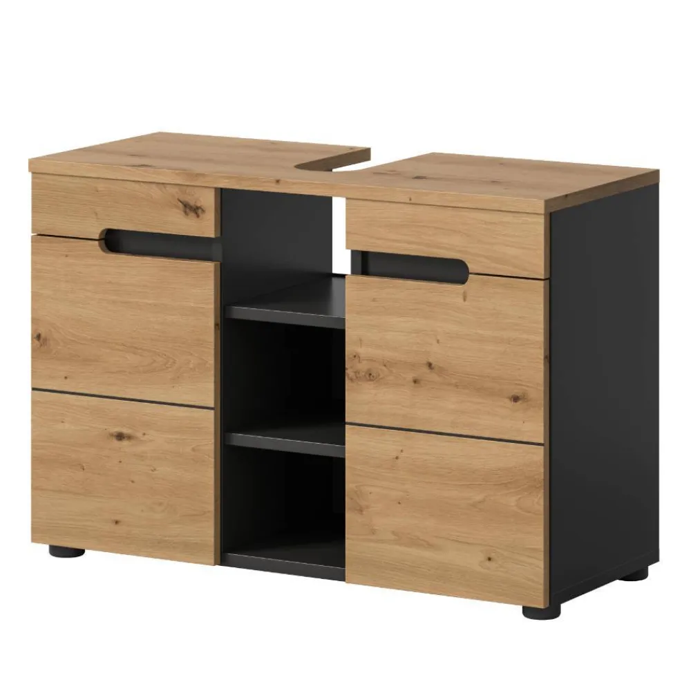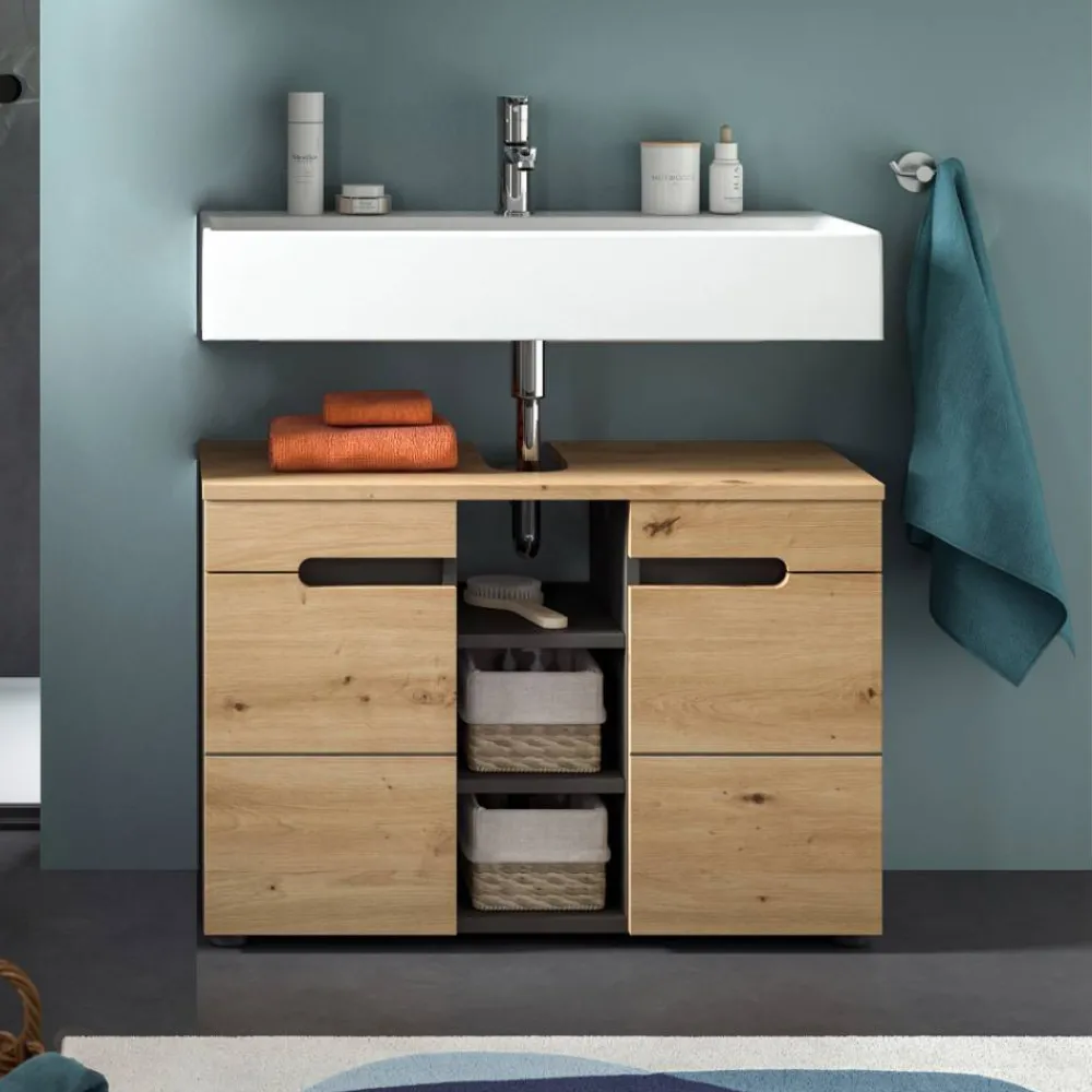 - Geräumiger Waschbeckenunterschrank in Wildeiche Holzoptik und Grau