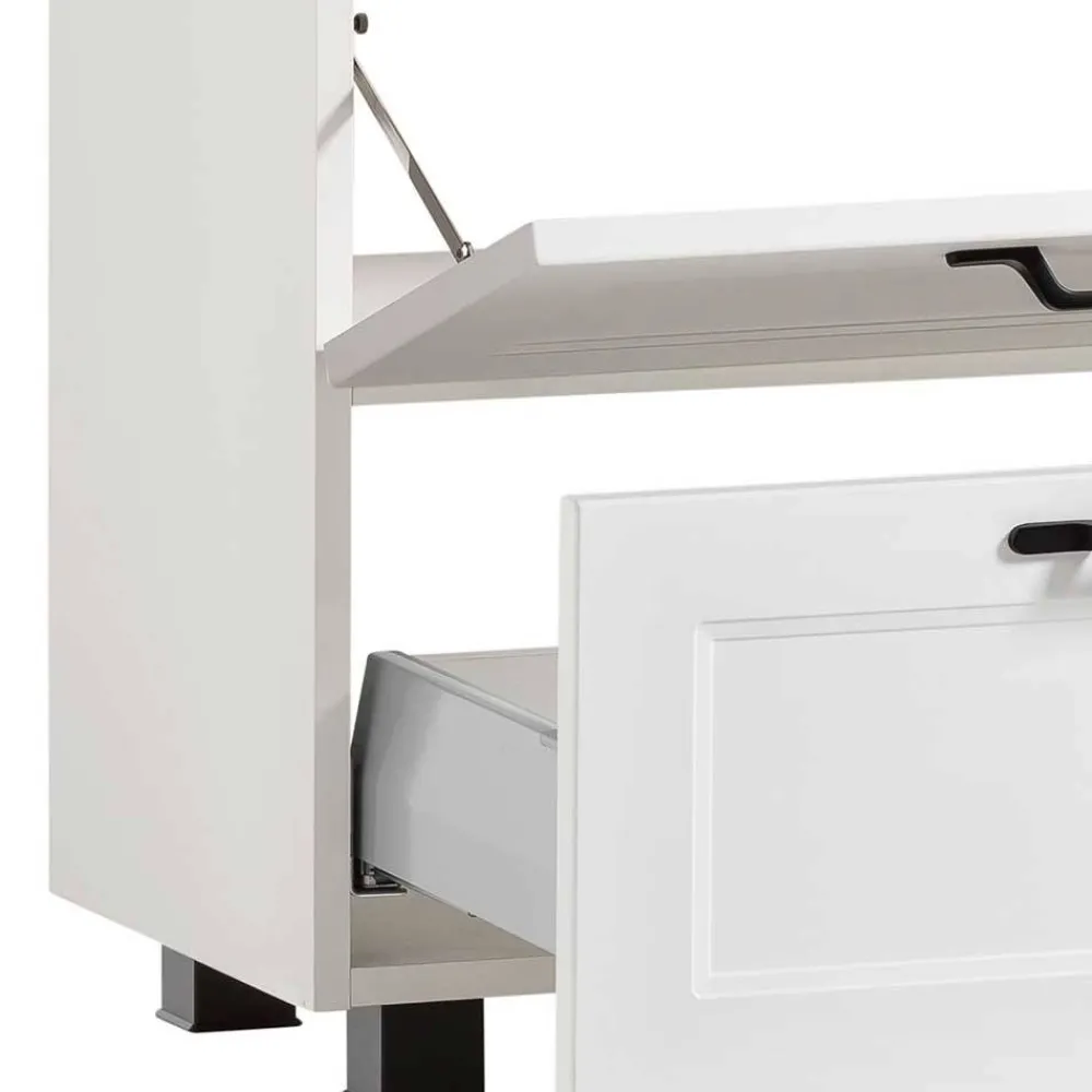 - Korpus melaminbeschichtet in Weiß und Holzoptik, Front weiß matt foliert