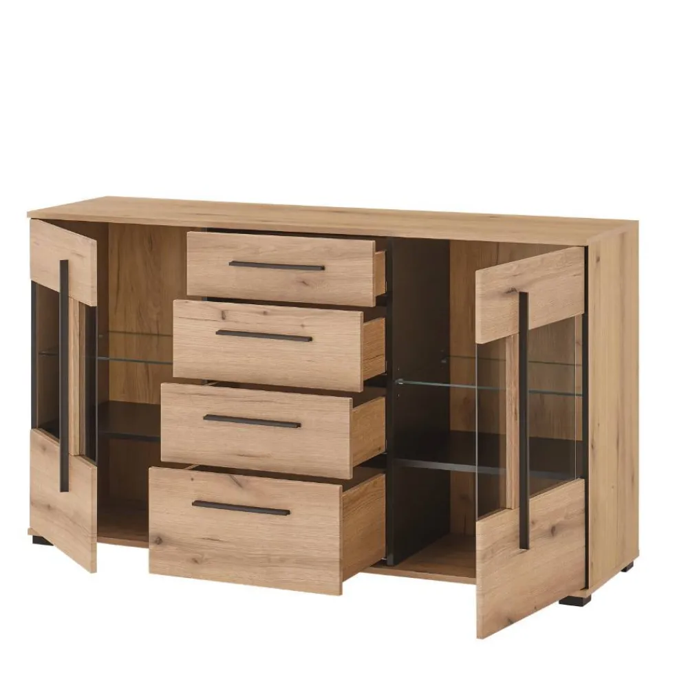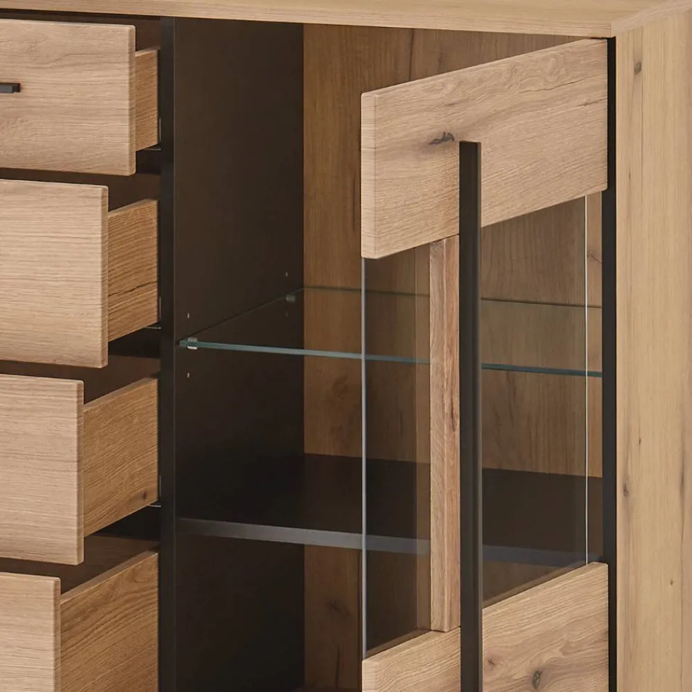 - Innen zwei Glasböden und zwei Holzwerkstoffböden