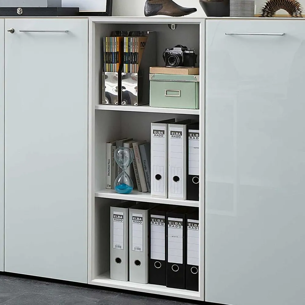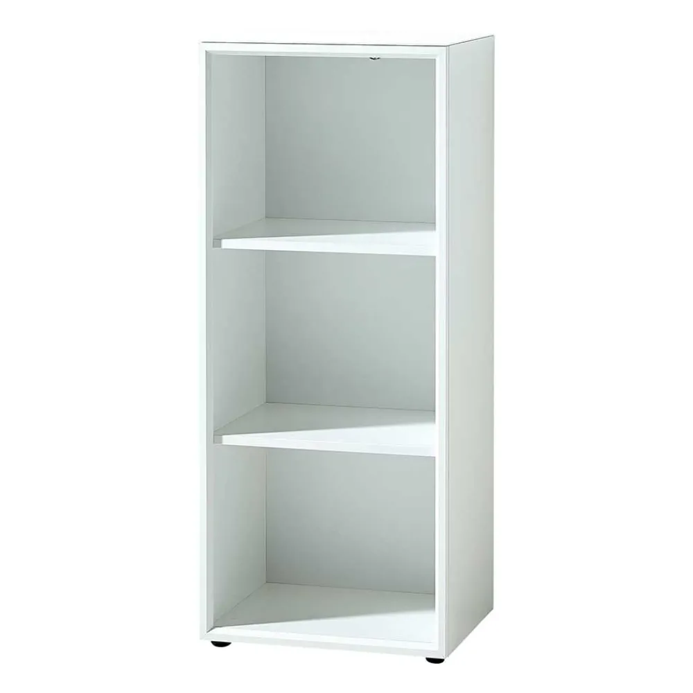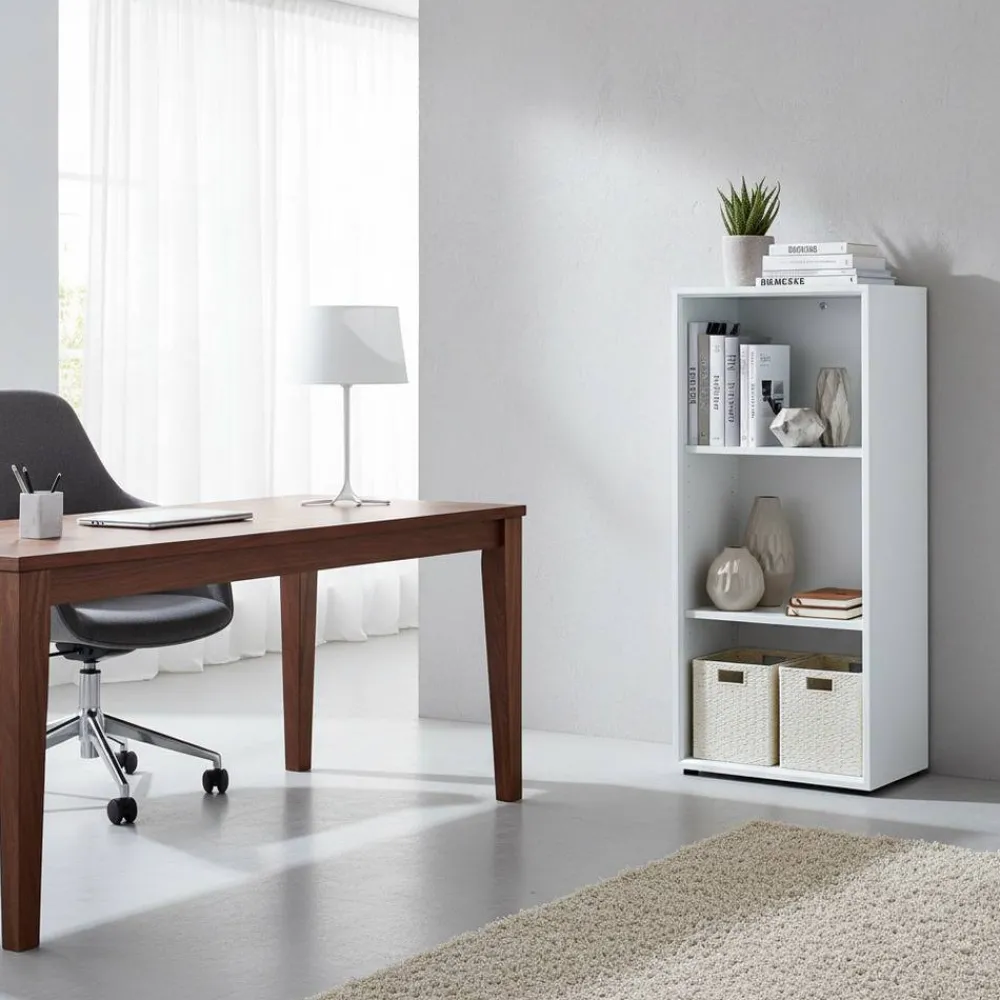- Drei Fächer bieten Stauraum für Ordner und Büromaterial