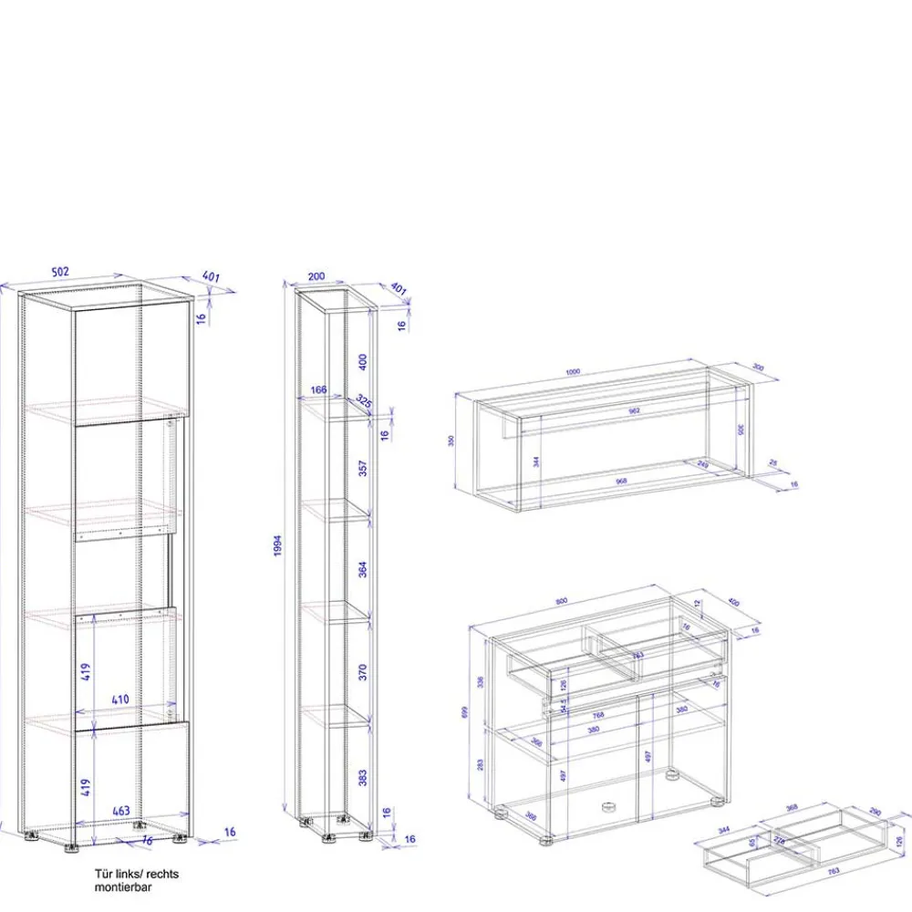 - Wandmontage sowie flache Kunststoffgleiter, bei den hohen Möbeln ist eine Kippsicherung an der Wand zusätzlich erforderlich