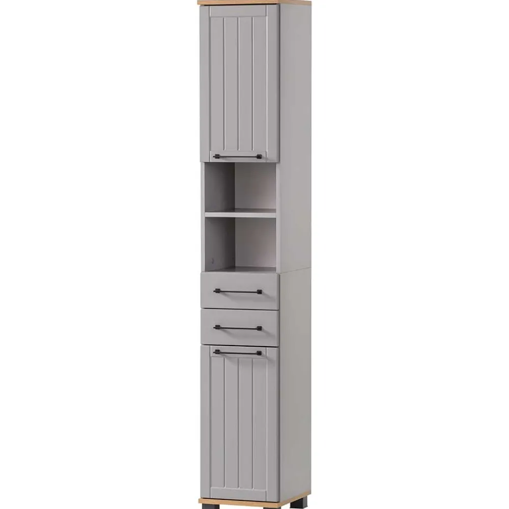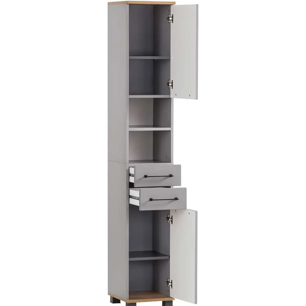- Geräumiger Bad Hochschrank in Platingrau und Eichefarben