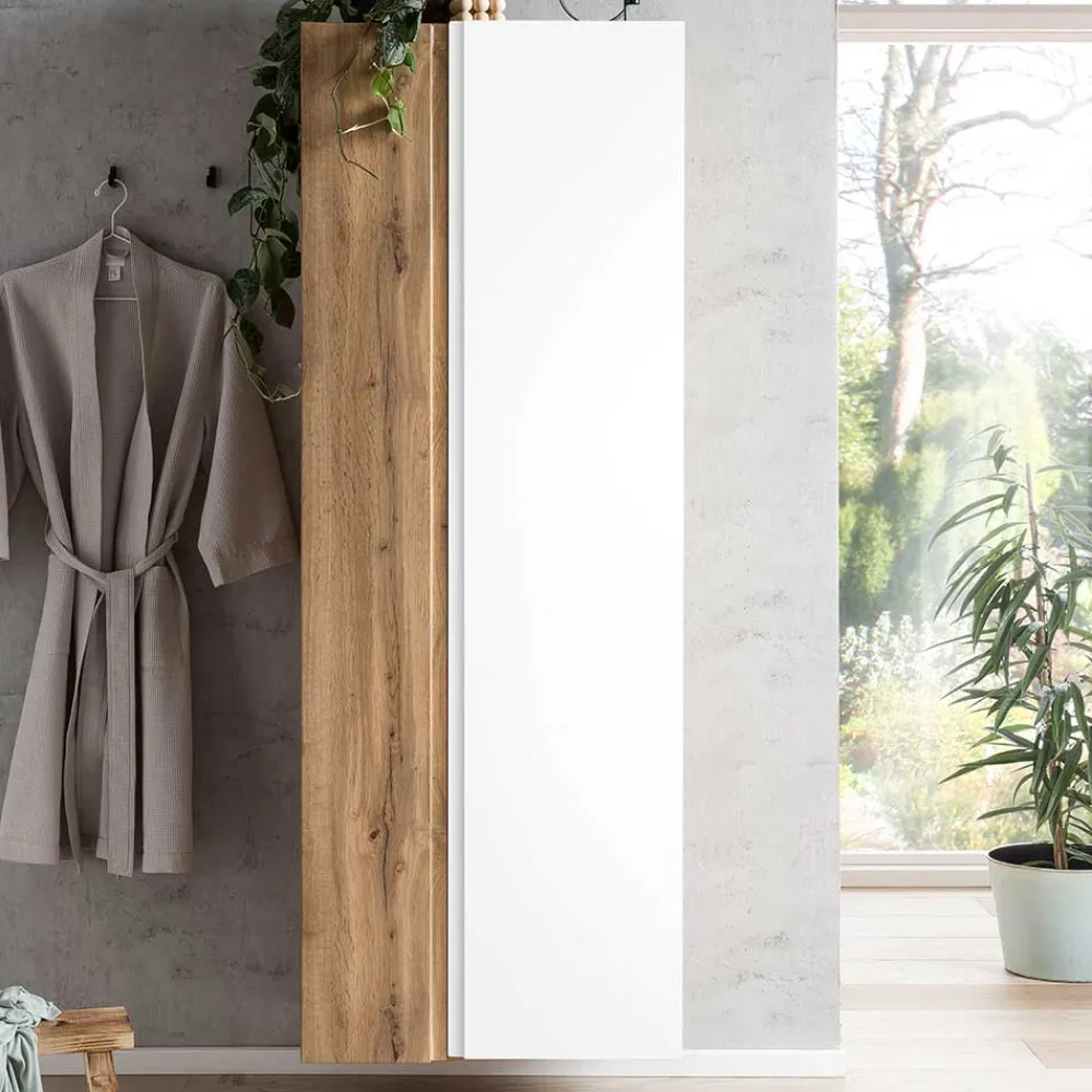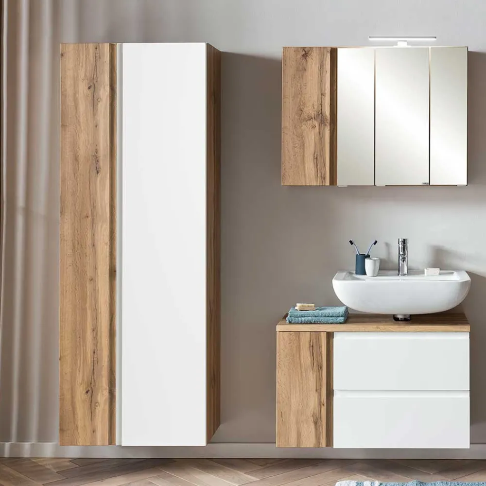 - Trendstarker Bad Hochschrank in Weiß und Wildeichefarben