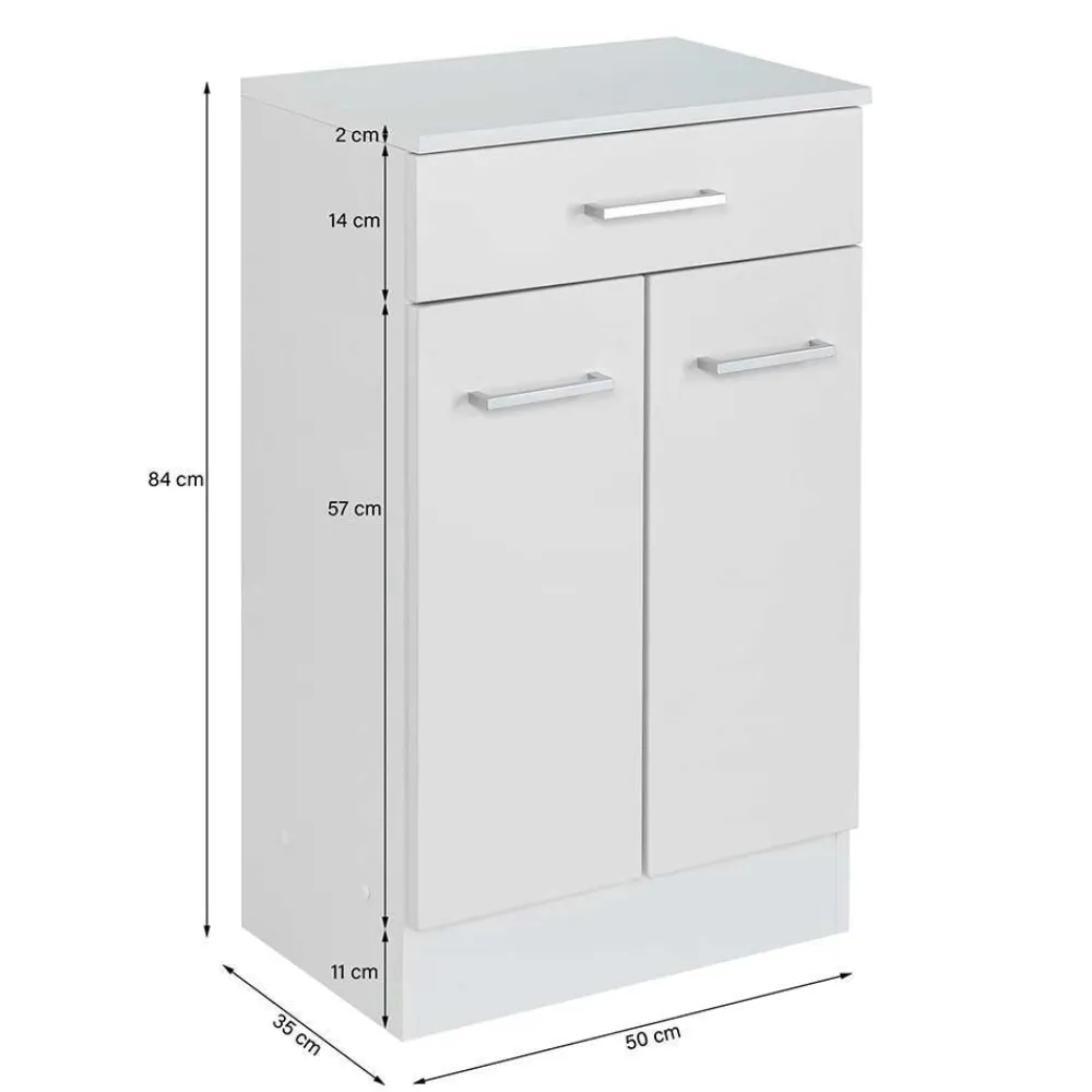 - Eine Schublade mit Metallauszug und zwei Türen, dahinter ein Einlegeboden