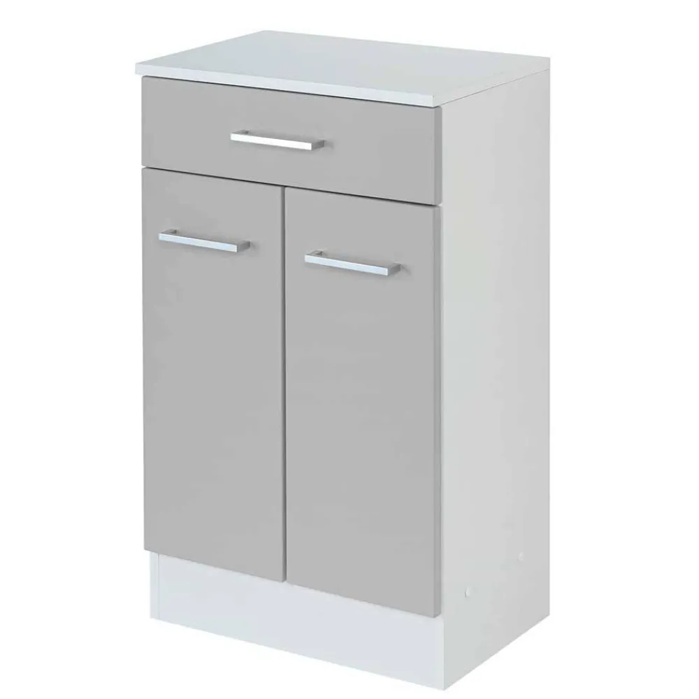- Korpus melaminbeschichtet in Weiß, Front hellgrau foliert