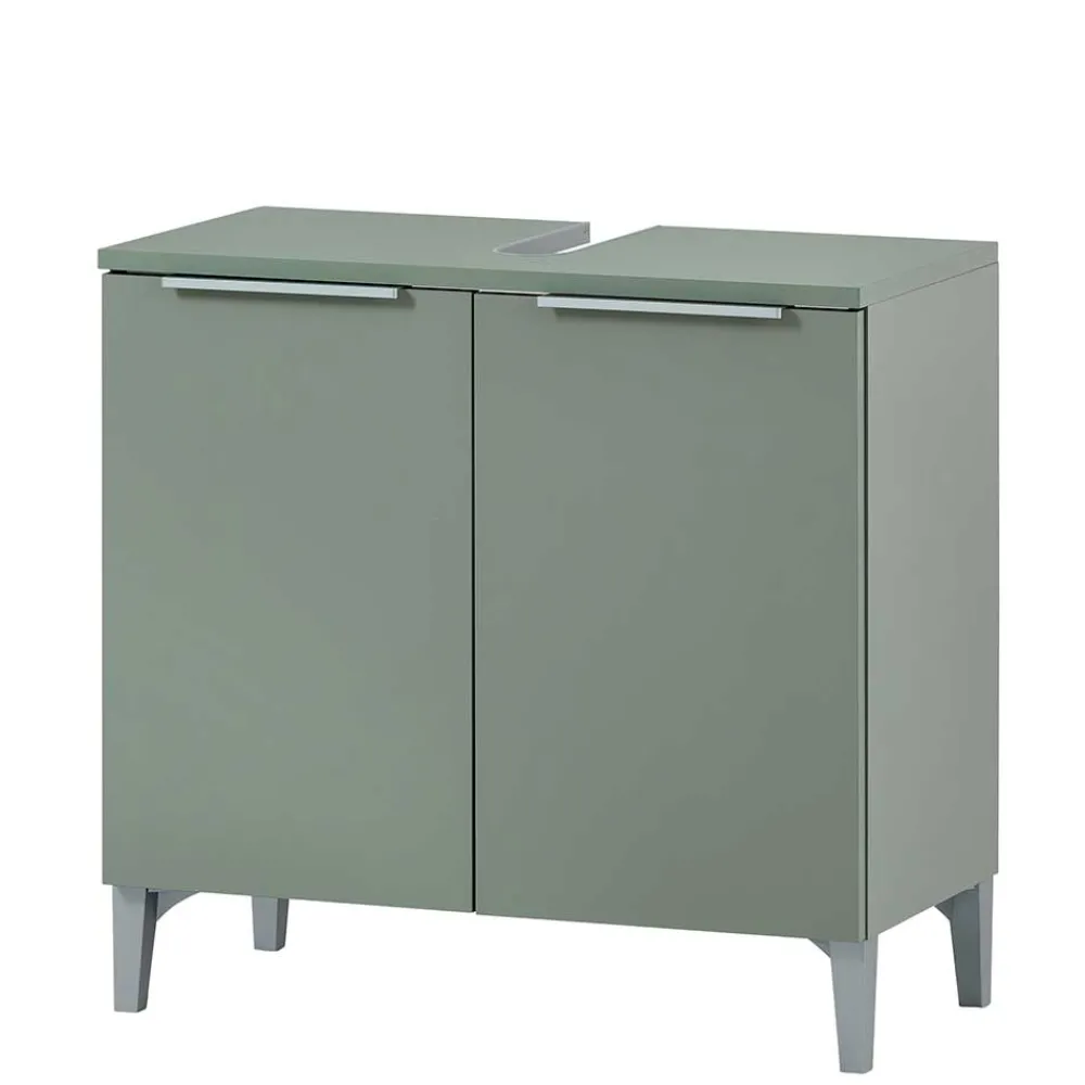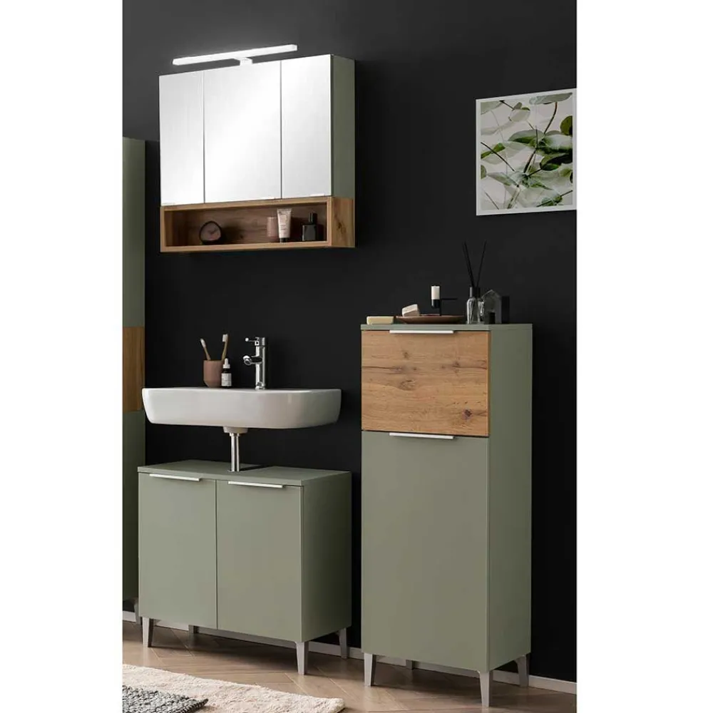 - Trendstarke Badmöbel in Graugrün und Eichefarben