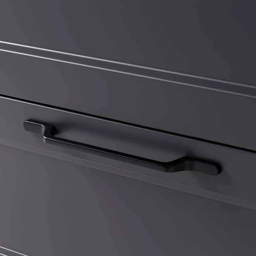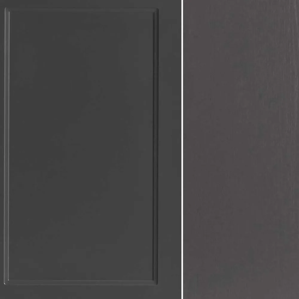 - Korpus melaminbeschichtet in Dunkelgau und Holzoptik, Front dunkelgrau matt foliert