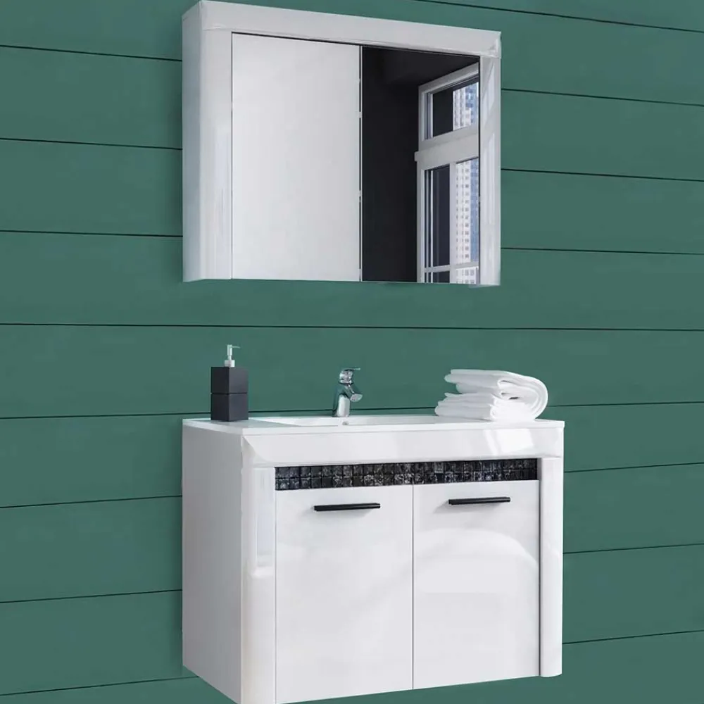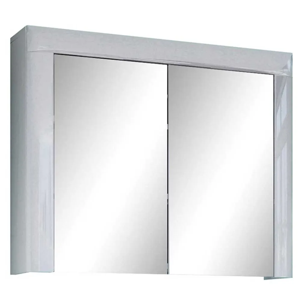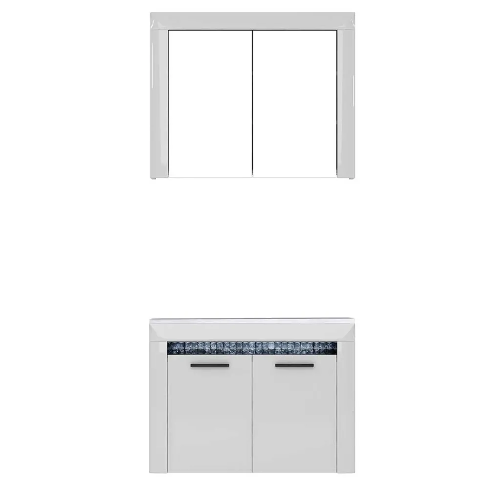 - Gefertigt aus Spiegelglas, MDF (Front), Spanplatte (Korpus) und Keramik