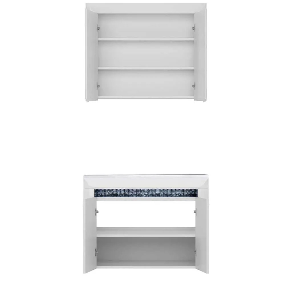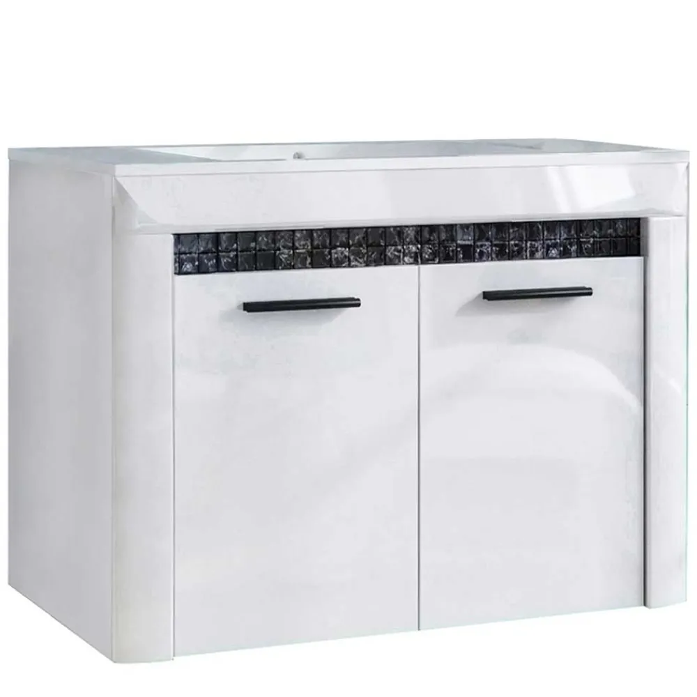 - Korpus melaminbeschichtet in Weiß, Front foliert in Weiß Hochglanz, tiefgezogene Kanten