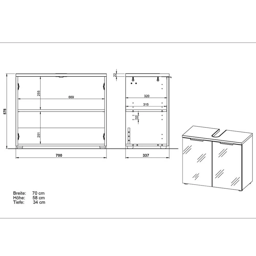 - Holzwerkstoff-Oberflächen mit Melaminharzbeschichtung, Oberboden in Holzoptik Eiche, Korpus in Weiß, Türen zusätzlich mit Einscheibensicherheitsglas beschichtet