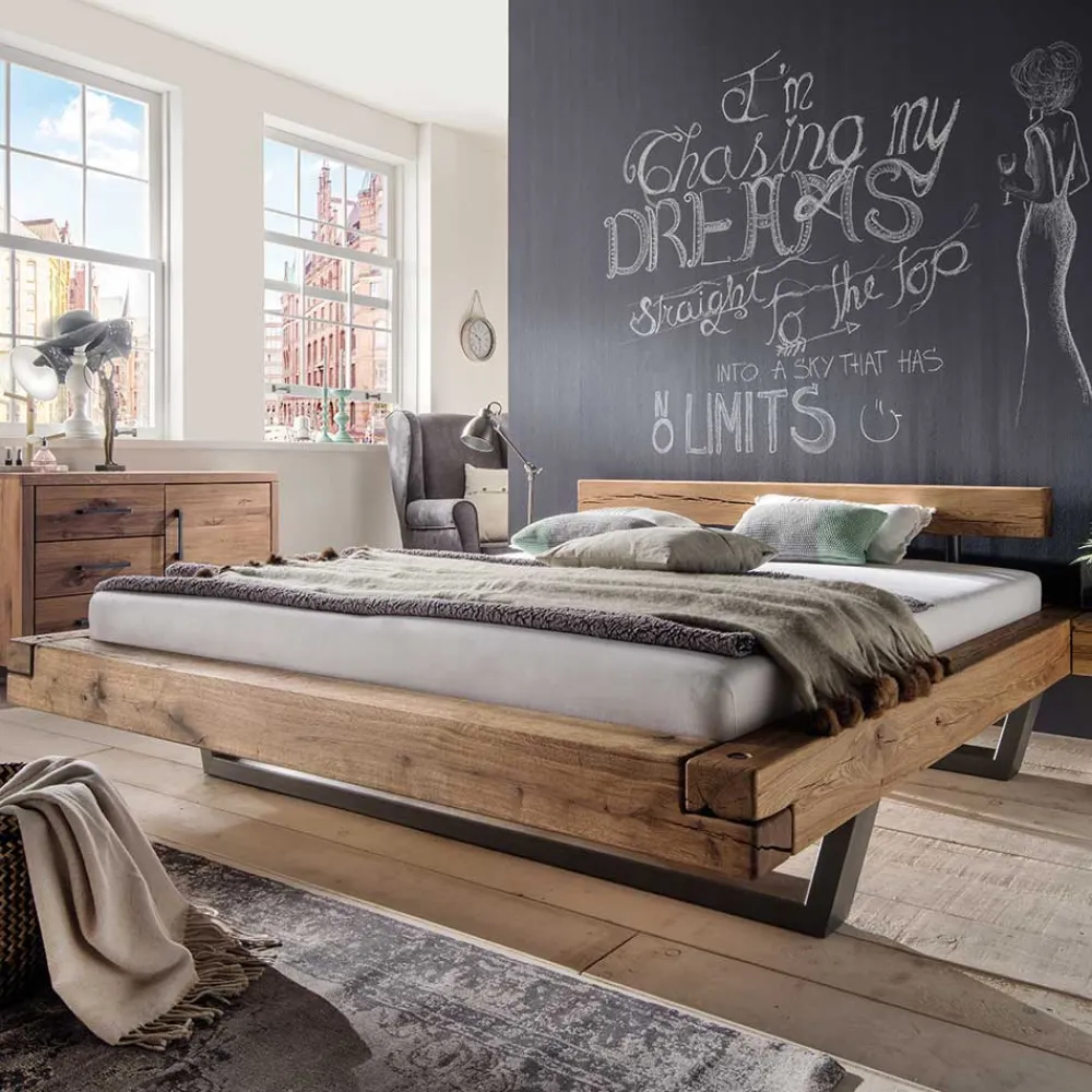 - Auf zwei leicht zurück gestellten Metallkufen stehend, sodass das Bett schwebend wirkt, Kufe jeweils 4×10 cm