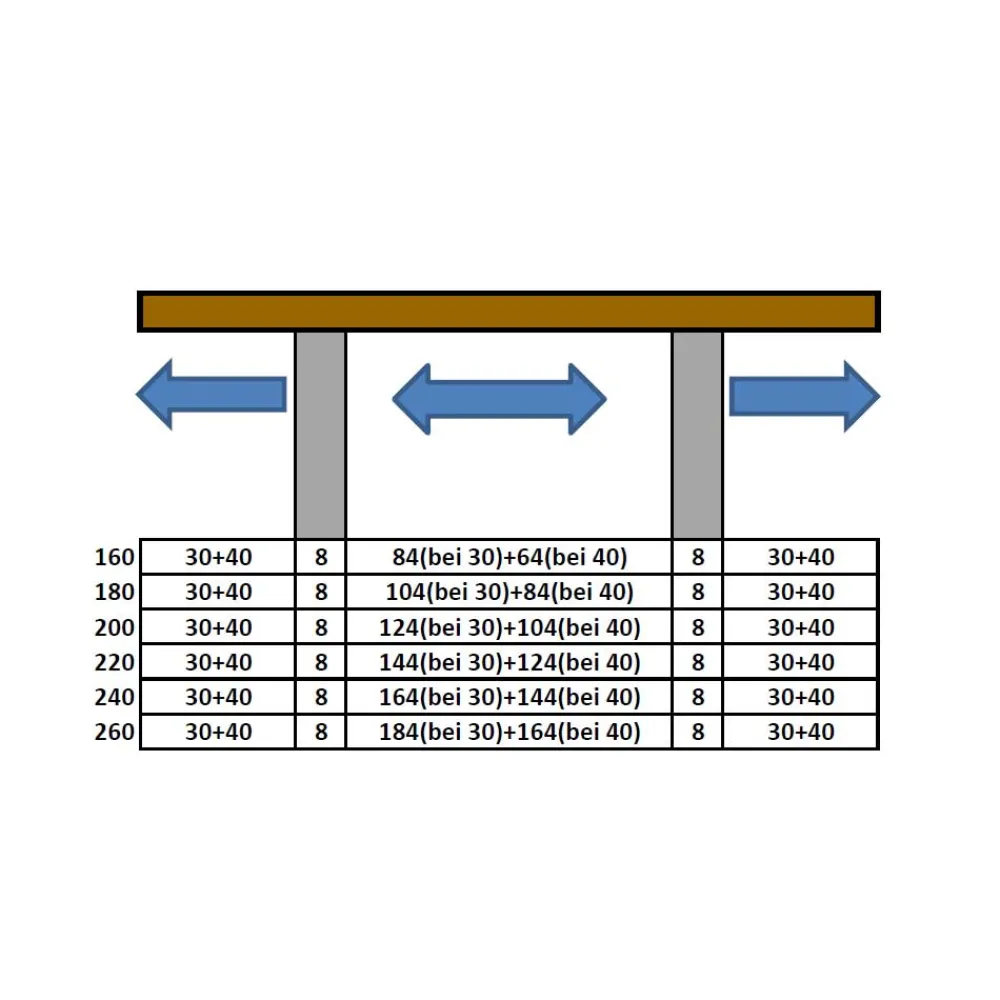 - 006: Breite: 260 / Tiefe: 100 / für acht Personen