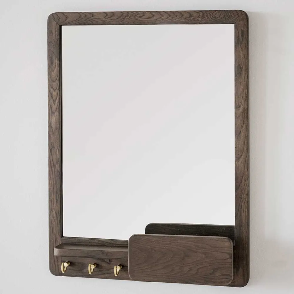 - Dekorativer Holzrahmen mit einer praktischen Ablage und drei Metallhaken in Messingfarben gebürstet