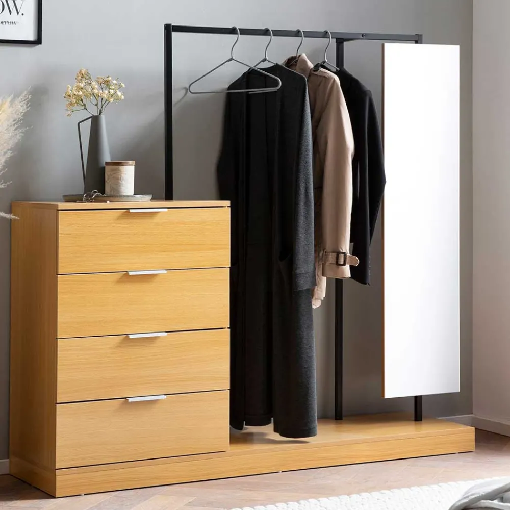 - Eine schwarz pulverbeschichtete Kleiderstange aus Metall bietet Platz zum Aufhängen von Jacken und Mänteln