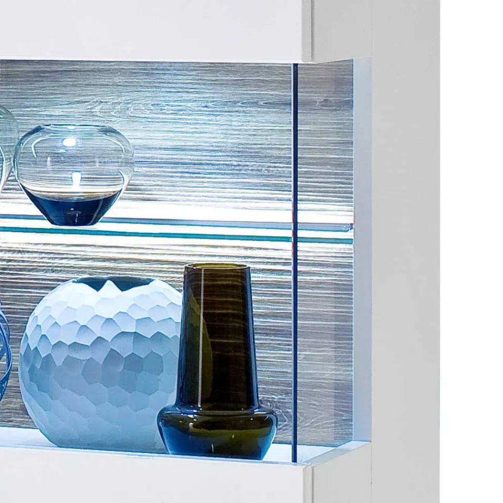 - Tür rechts mit Glaseinsatz in Parsol grau, Rückwand in 3D Optik Balkeneiche abgesetzt, Tür links mit kontrastfarbiger Absetzung