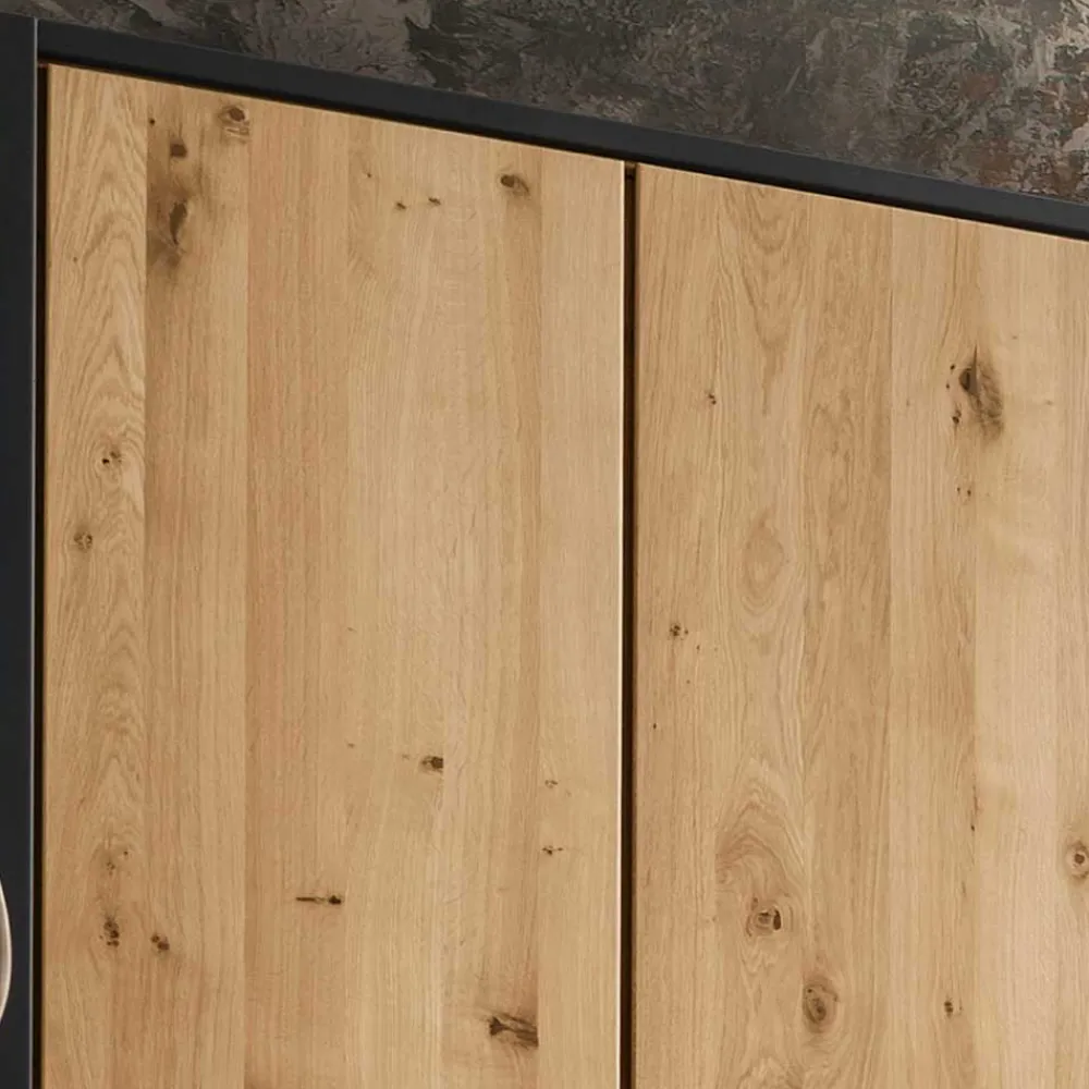 - Aus Wildeiche Massivholz (Kopfteil, Fronten) und Spanplatte (Wange, Bettseiten, Korpus, Einlegeböden) gefertigt