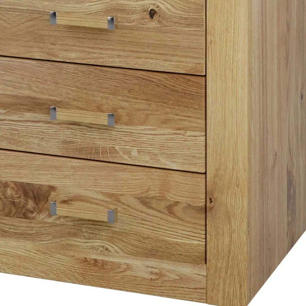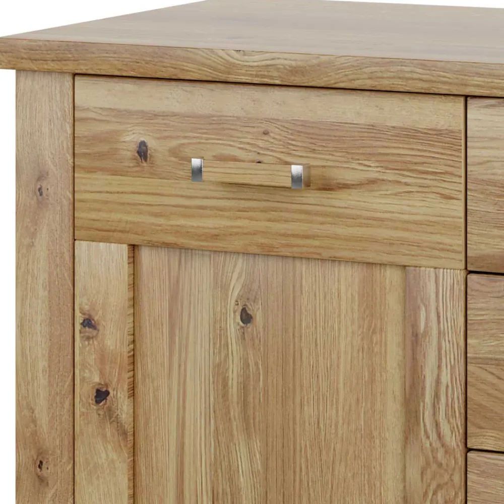 - Frontrahmen massiv, Füllungen aus Holzwerkstoff mit Asteiche furniert, Korpus in Holzoptik foliert, Holzoberflächen geölt