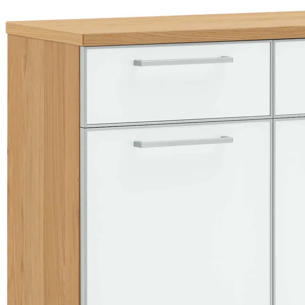 - Korpus mit Eiche Echtholz furniert und lackiert, Fronten aus Spanplatte mit Glas beschichtet, von hinten lackiert und mit umlaufendem MDF-Rahmen in Alufarben eingefasst