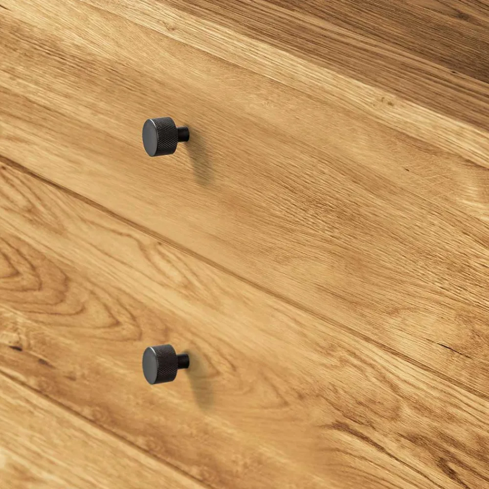 - Schwarze, zylinderförmige Metallgriffe mit eingraviertem Rautenmuster