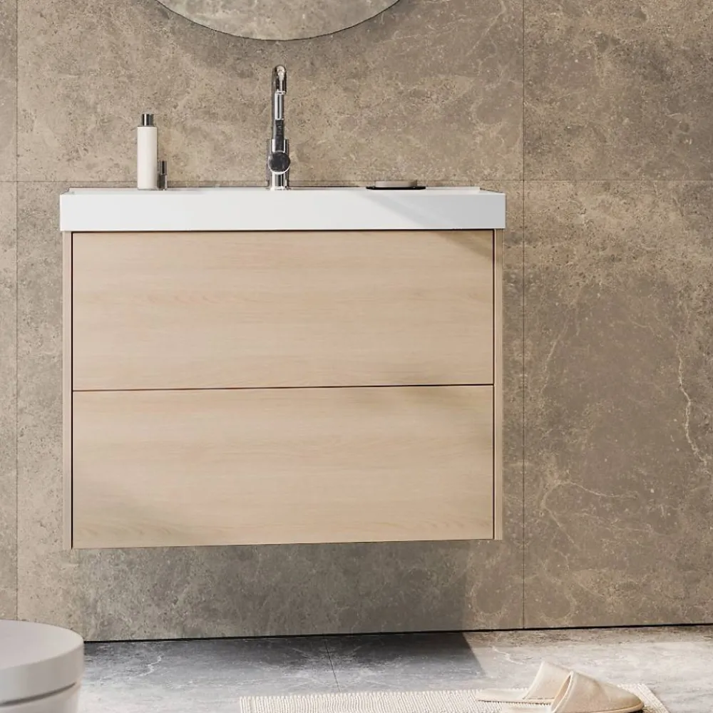 - Eingelassenes Keramik-Waschbecken in Weiß inklusive, mittig ein vorgefertigtes Loch zur Montage der Armaturen