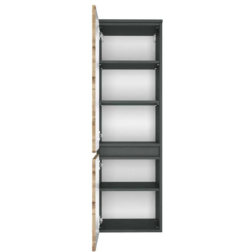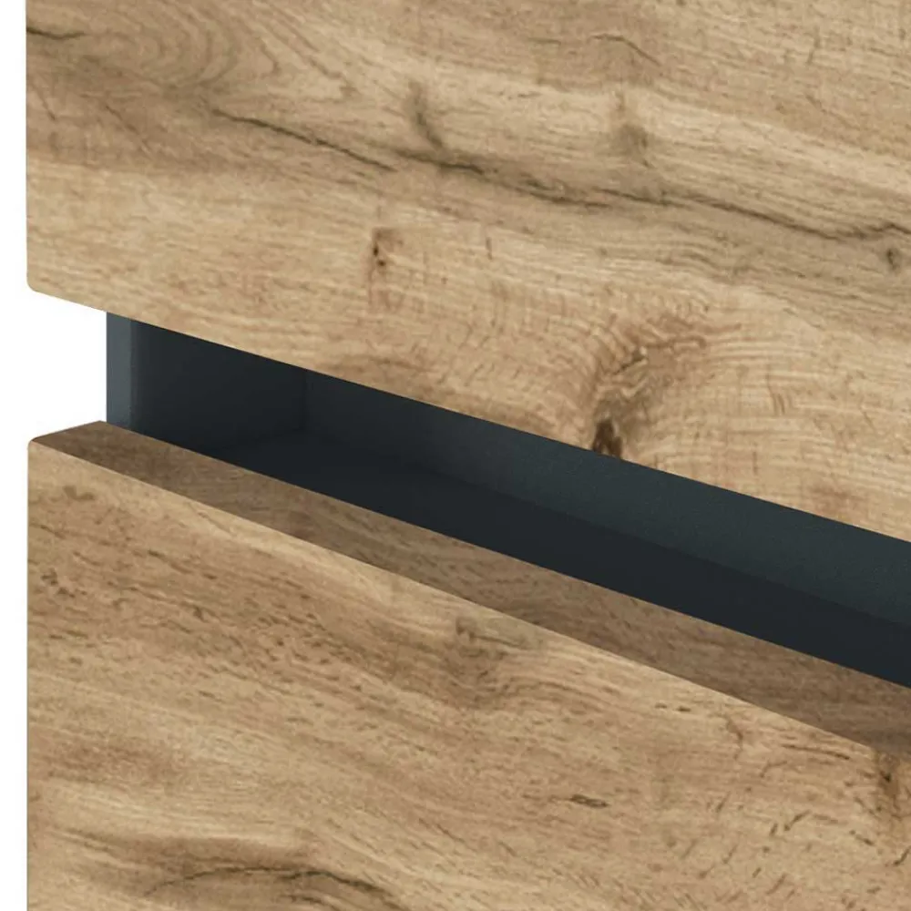 - Korpus melaminbeschichtet in Anthrazit, Front foliert in Holzoptik Wildeiche, weiße Rückwand
