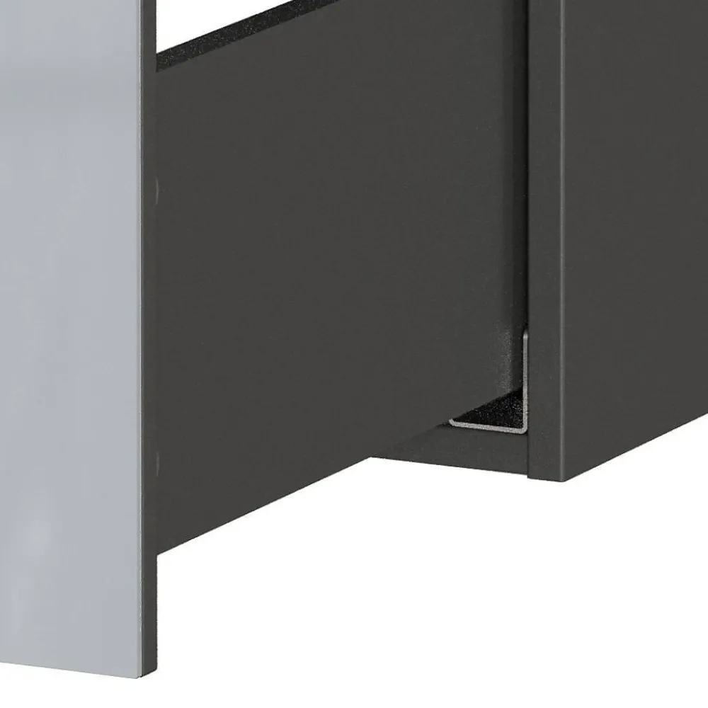 - Oberflächen in Dunkelgrau melaminbeschichtet, Front mit Glas in Silbergrau beschichtet