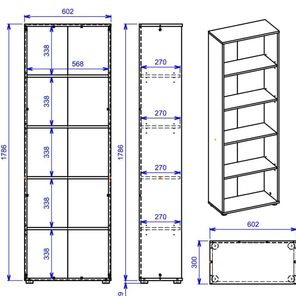 - Mit vier Einlegeböden, fünf Fächer